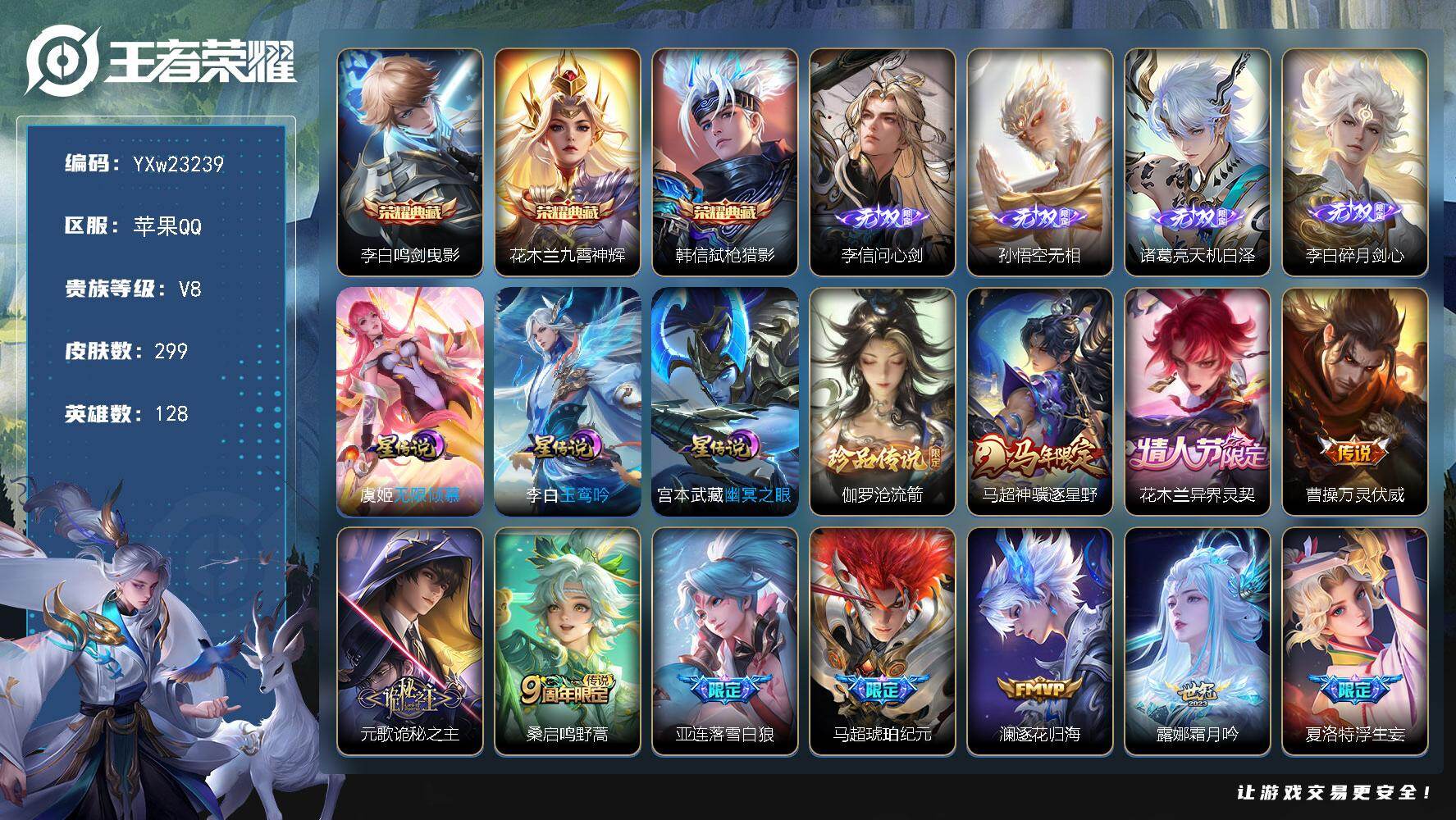 贵族等级: V7 英雄数: 128 皮肤数: 225 珍品传说: 器灵·落星盏