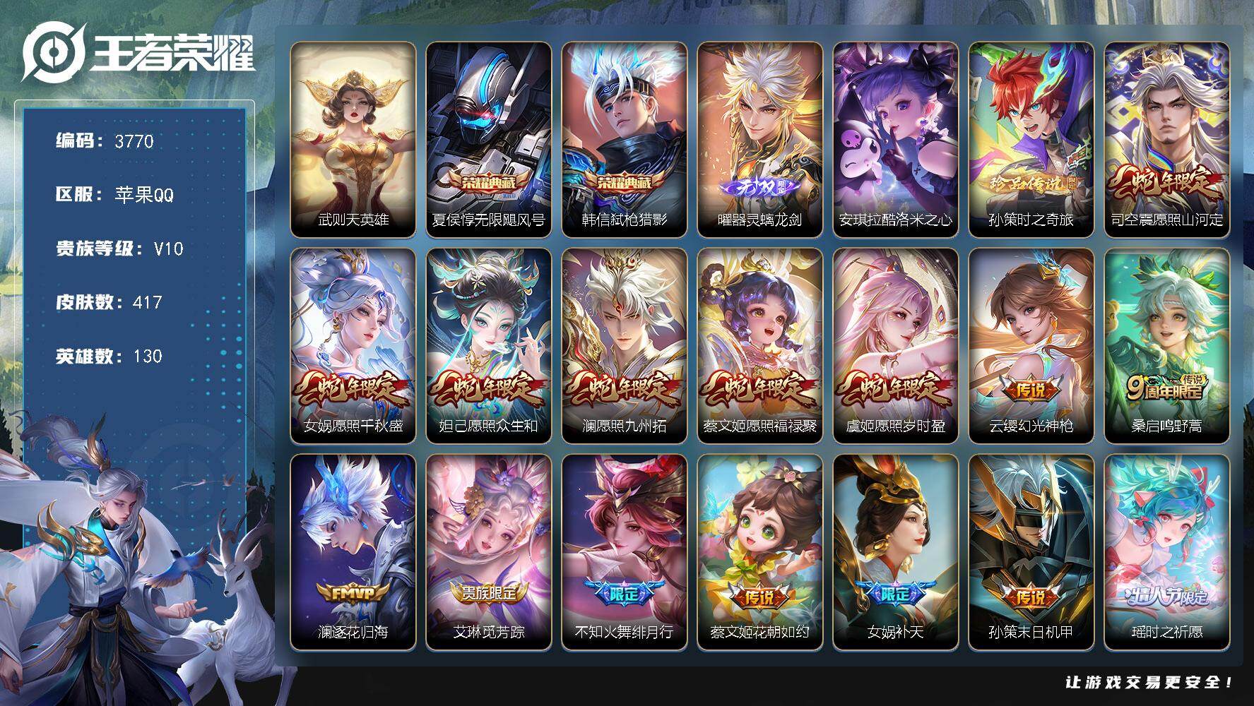V10-最强王者段位-130英雄-417皮肤-2典藏皮肤-1典藏英雄-1无双-2珍品传说-47传说-125史诗