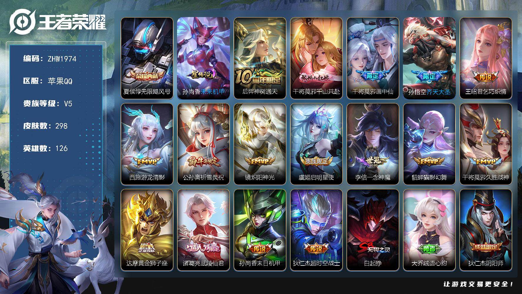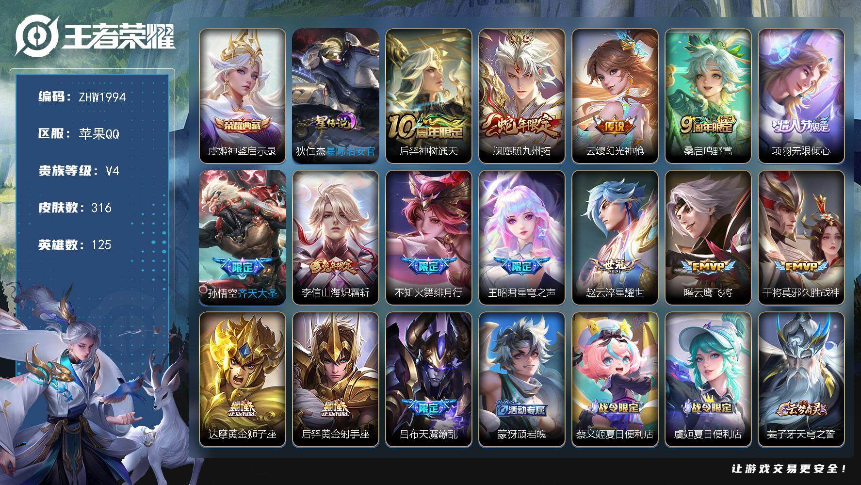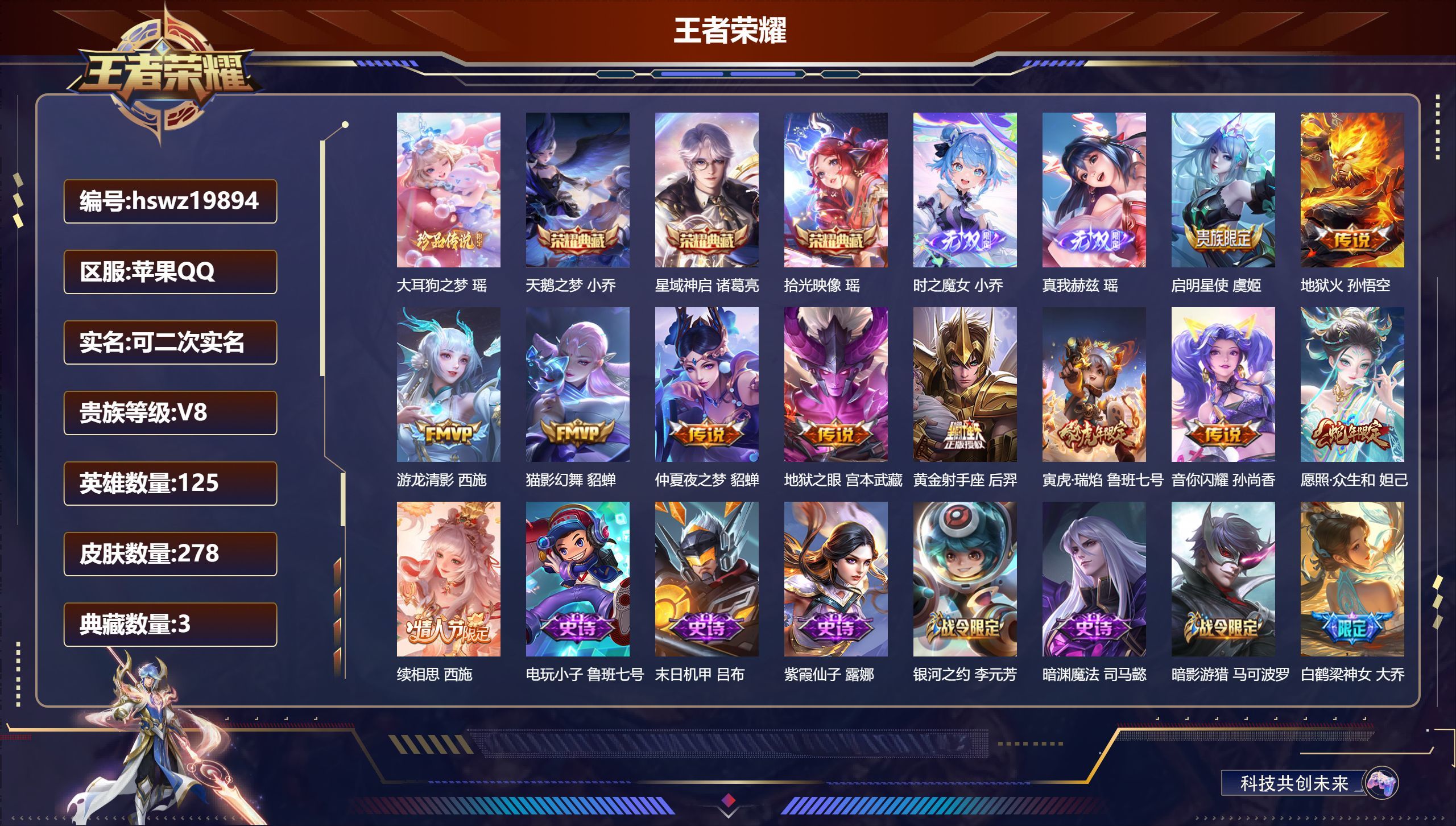 苹果QQ/至尊星耀/278皮肤/125英雄/3典藏/0珍品无双/2无双/1珍品传说/11传说/59史