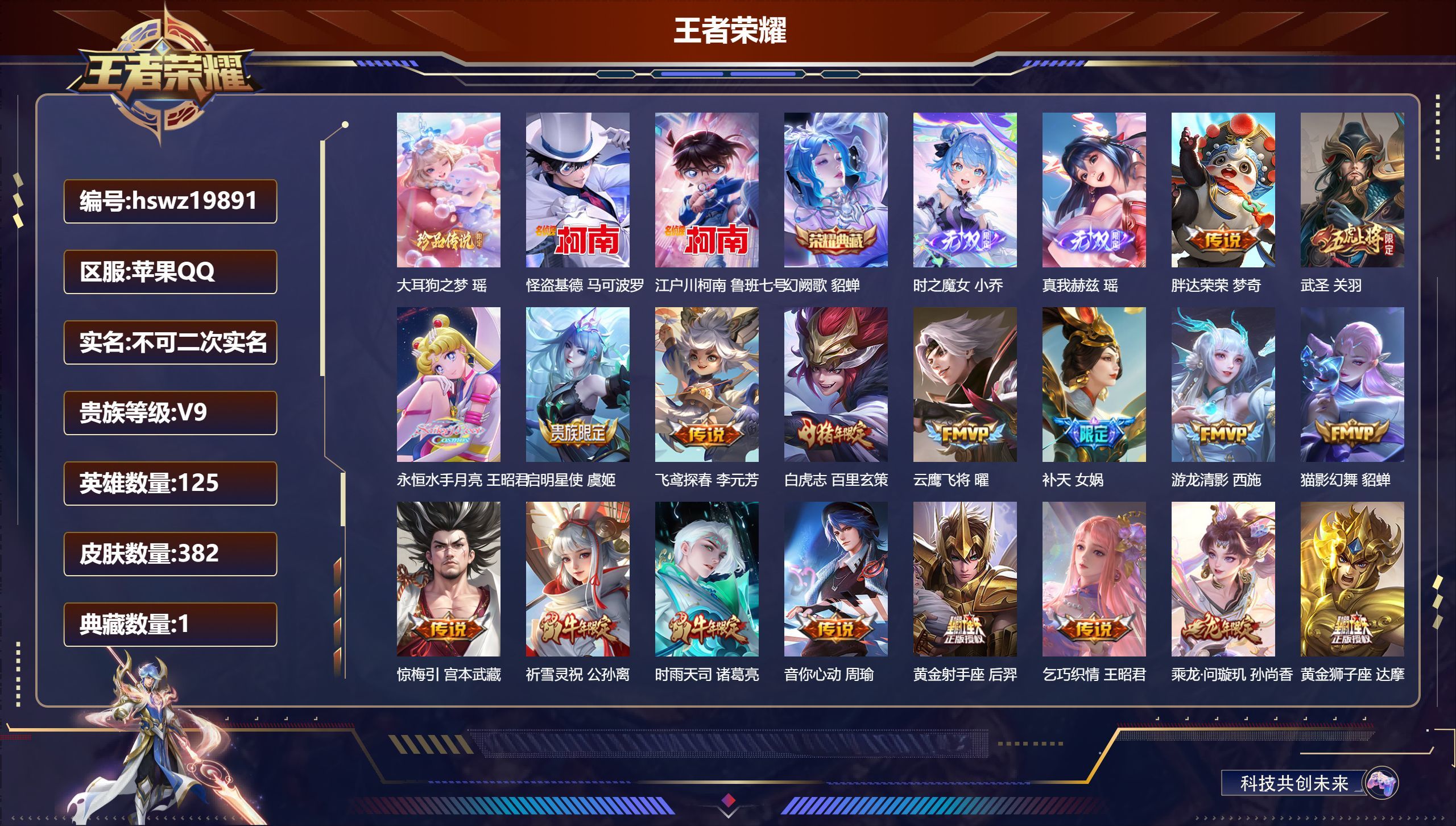 苹果QQ/至圣王者/382皮肤/125英雄/1典藏/0珍品无双/2无双/3珍品传说/34传说/113