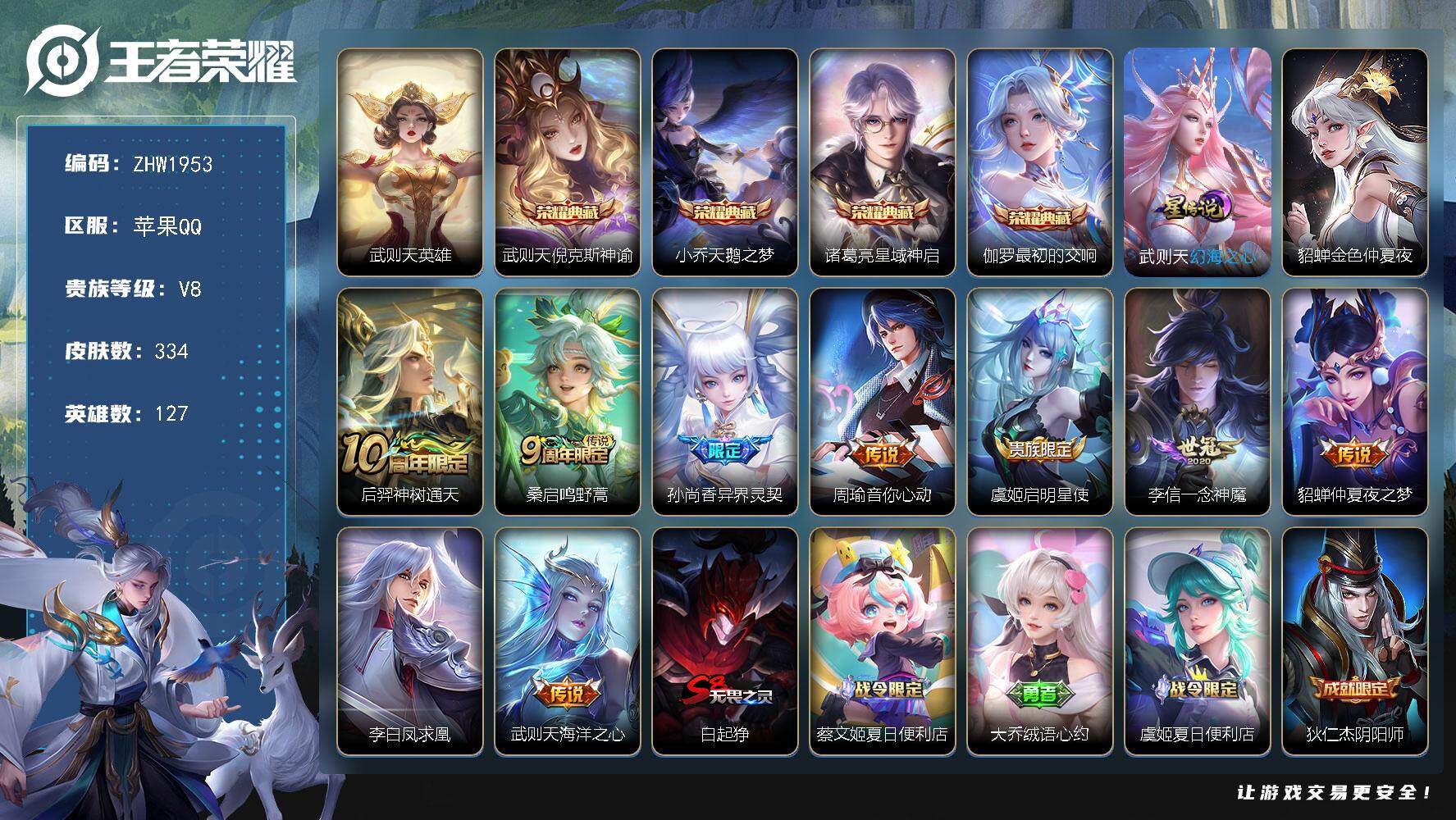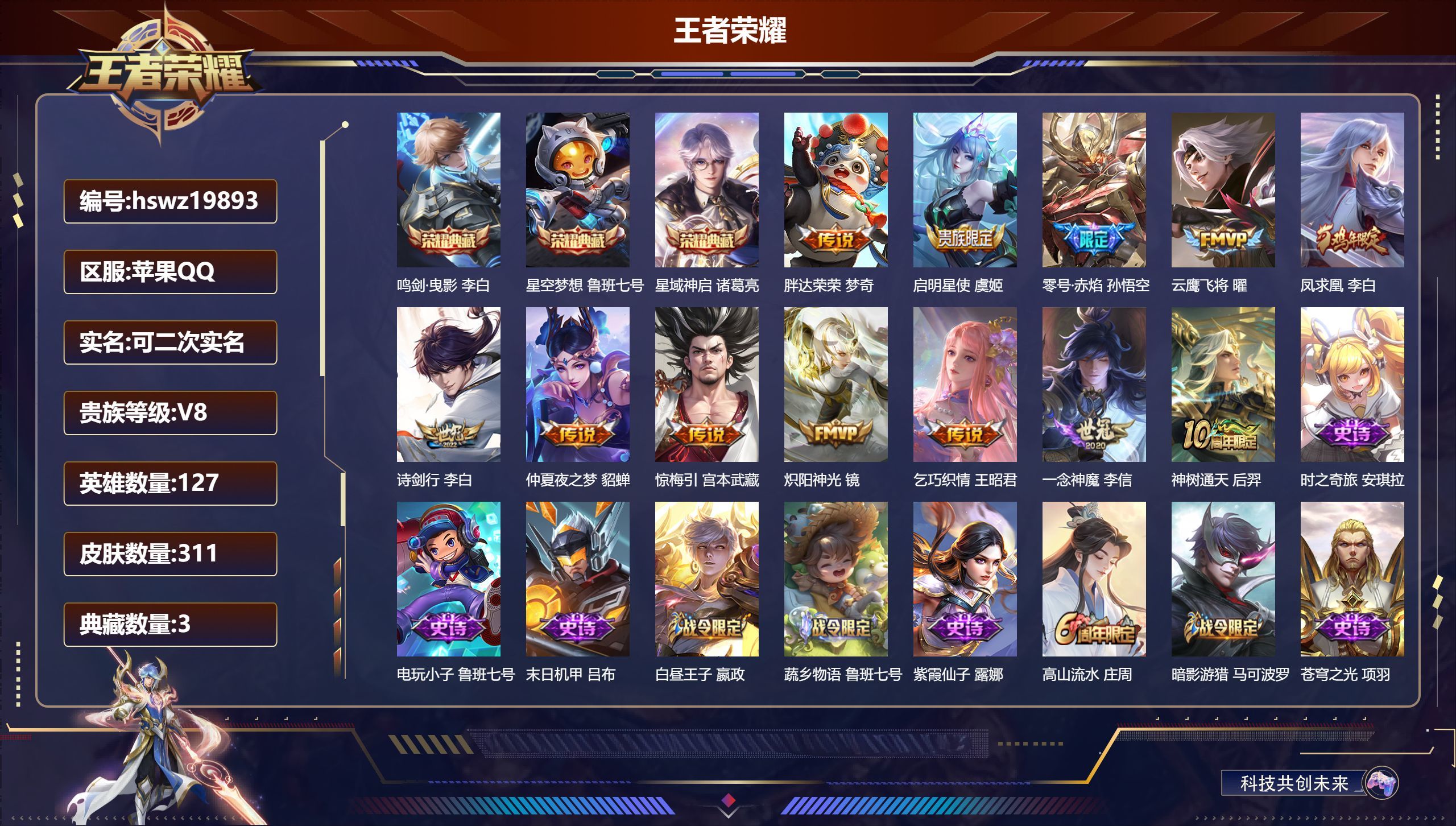 苹果QQ/至尊星耀/311皮肤/127英雄/3典藏/0珍品无双/0无双/0珍品传说/12传说/94史
