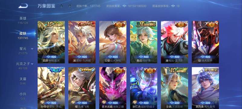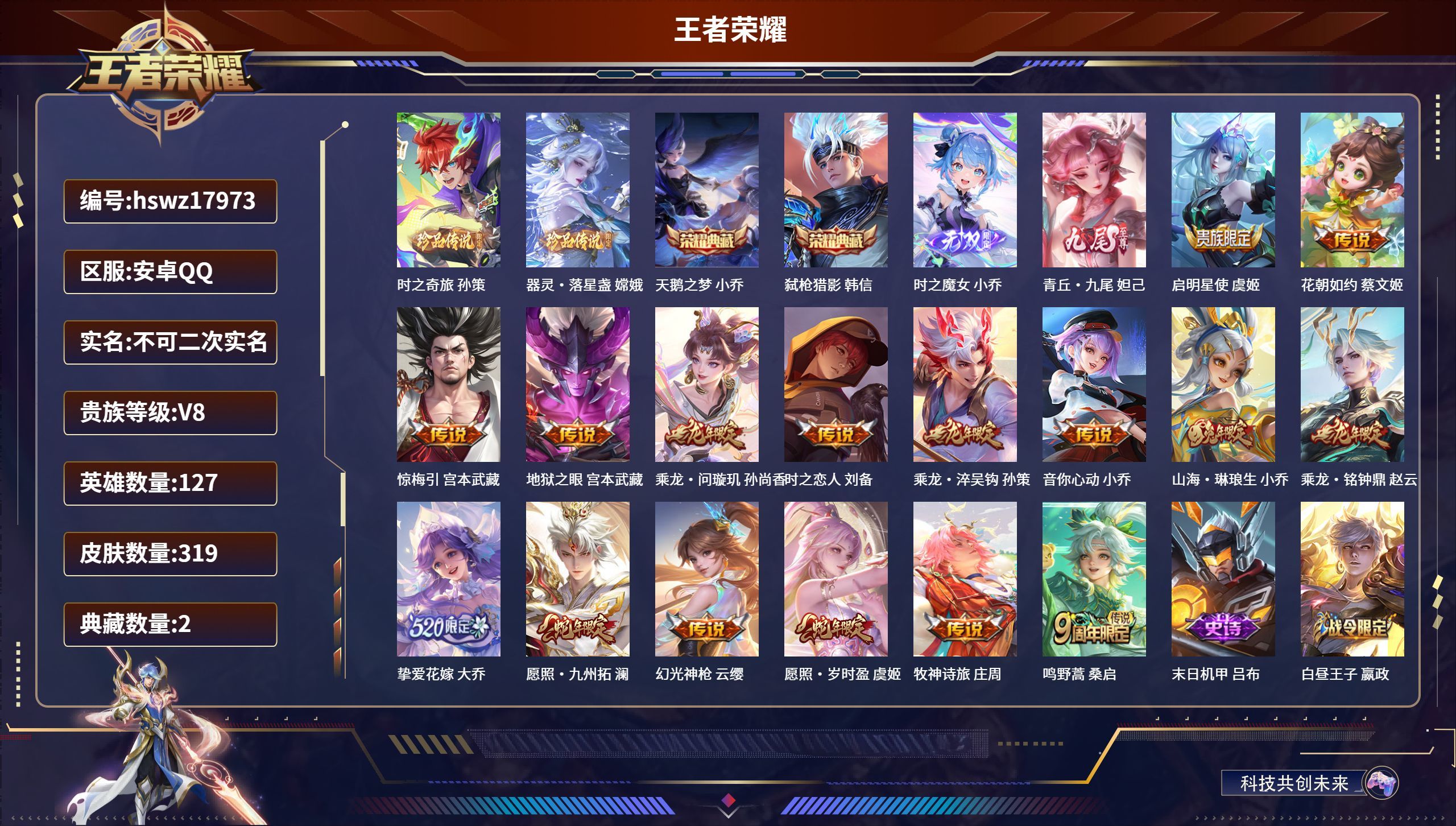 王者荣耀【安卓QQ】安卓QQ/最强王者/319皮肤/127英雄/2典藏/0珍品无双/2无双/2珍品传说/16传说/81史