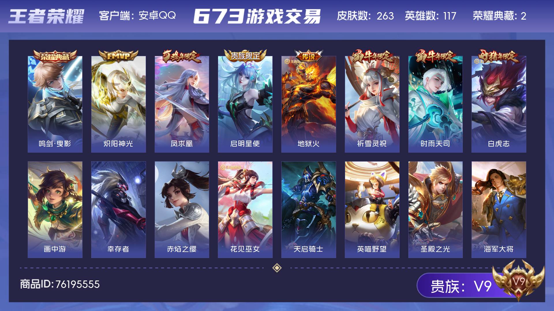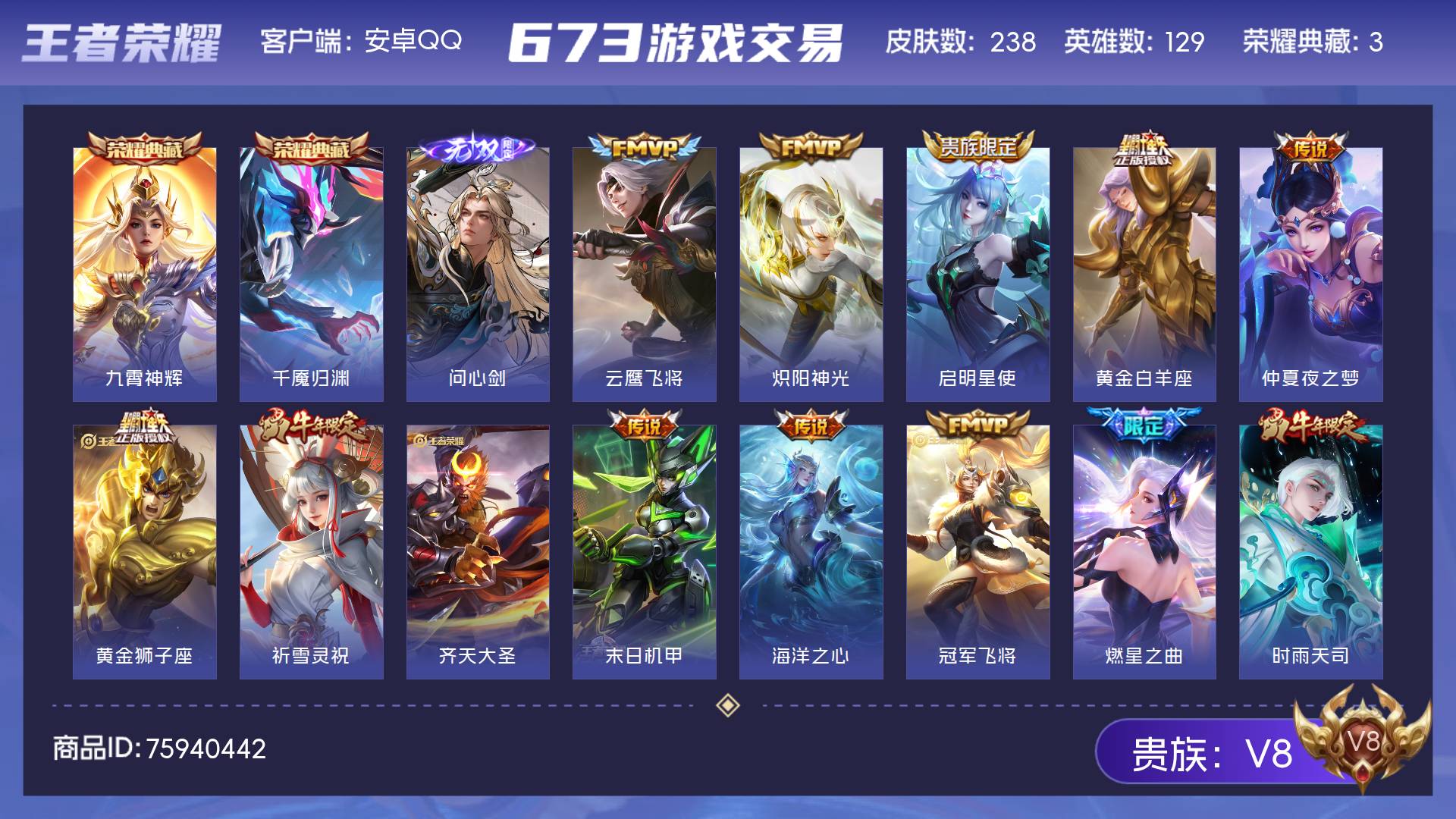 安卓QQ 皮肤238 英雄129 至圣王者 荣耀典藏3 无双皮肤1 传说19 其他皮肤223