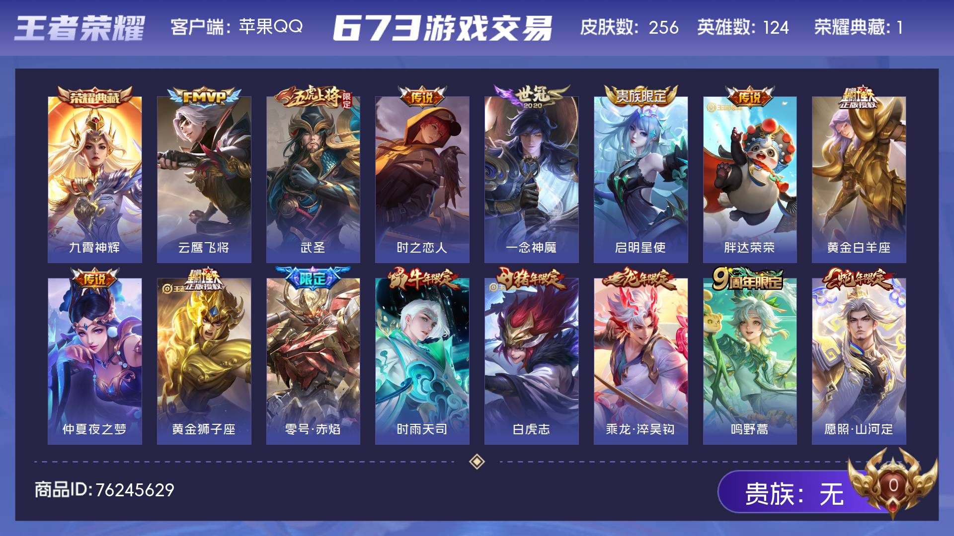 苹果QQ 可二次 皮肤256 英雄124 尊贵铂金 荣耀典藏1 传说15- 背包里面还有一颗水晶