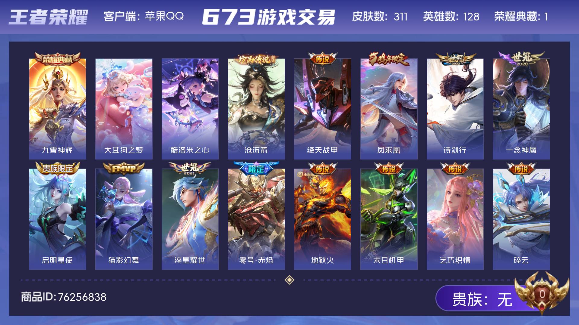 苹果QQ 可二次 皮肤311 英雄128 永恒钻石 荣耀典藏1 珍品传说3 传说16