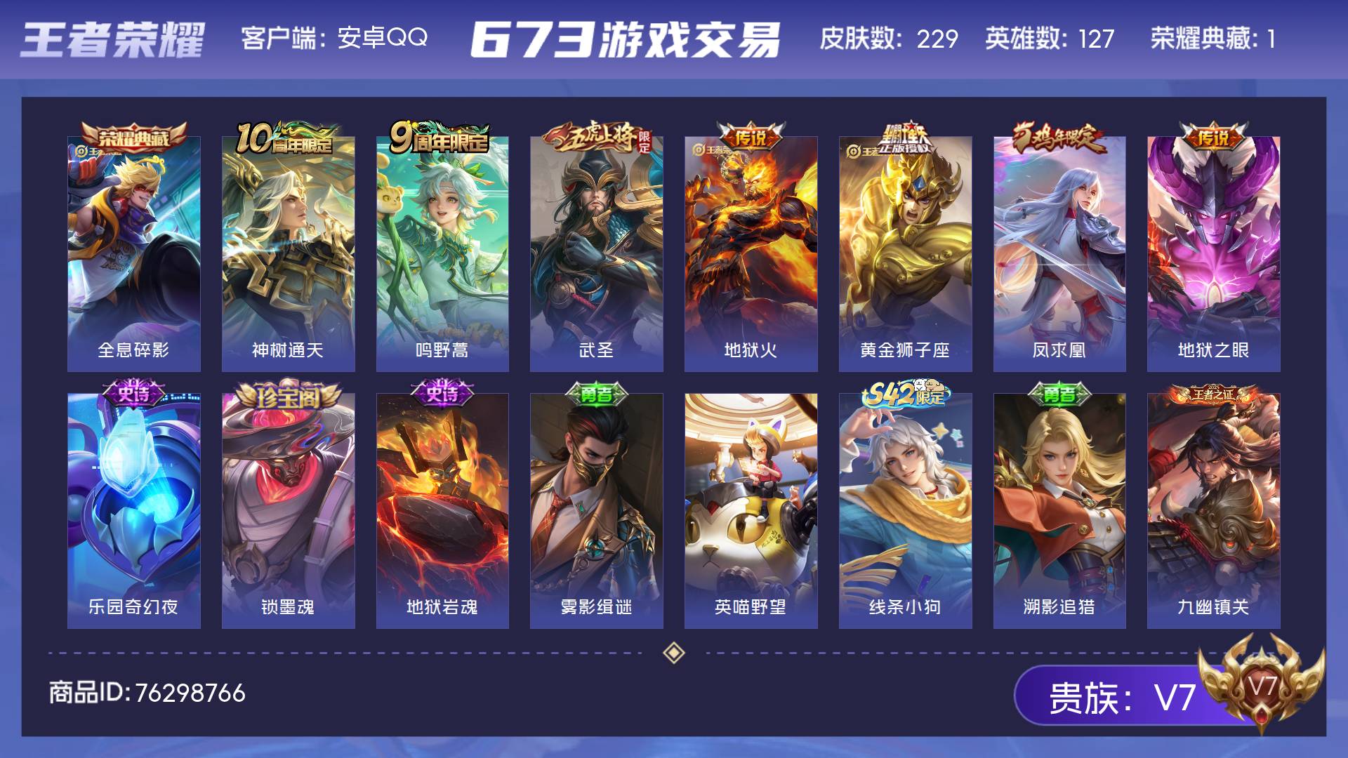 V7 皮肤229 英雄127 至尊星耀 荣耀典藏1 星传说2 传说7