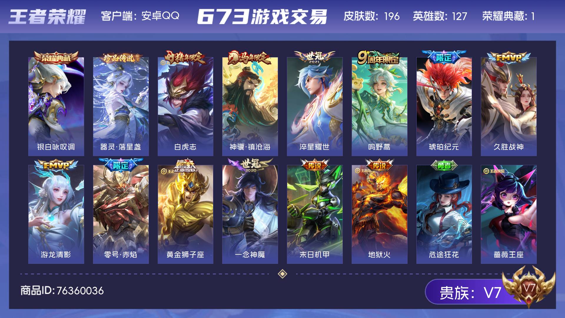 V7 皮肤196 英雄127 至尊星耀 荣耀典藏1 珍品传说1 星传说1 传说12