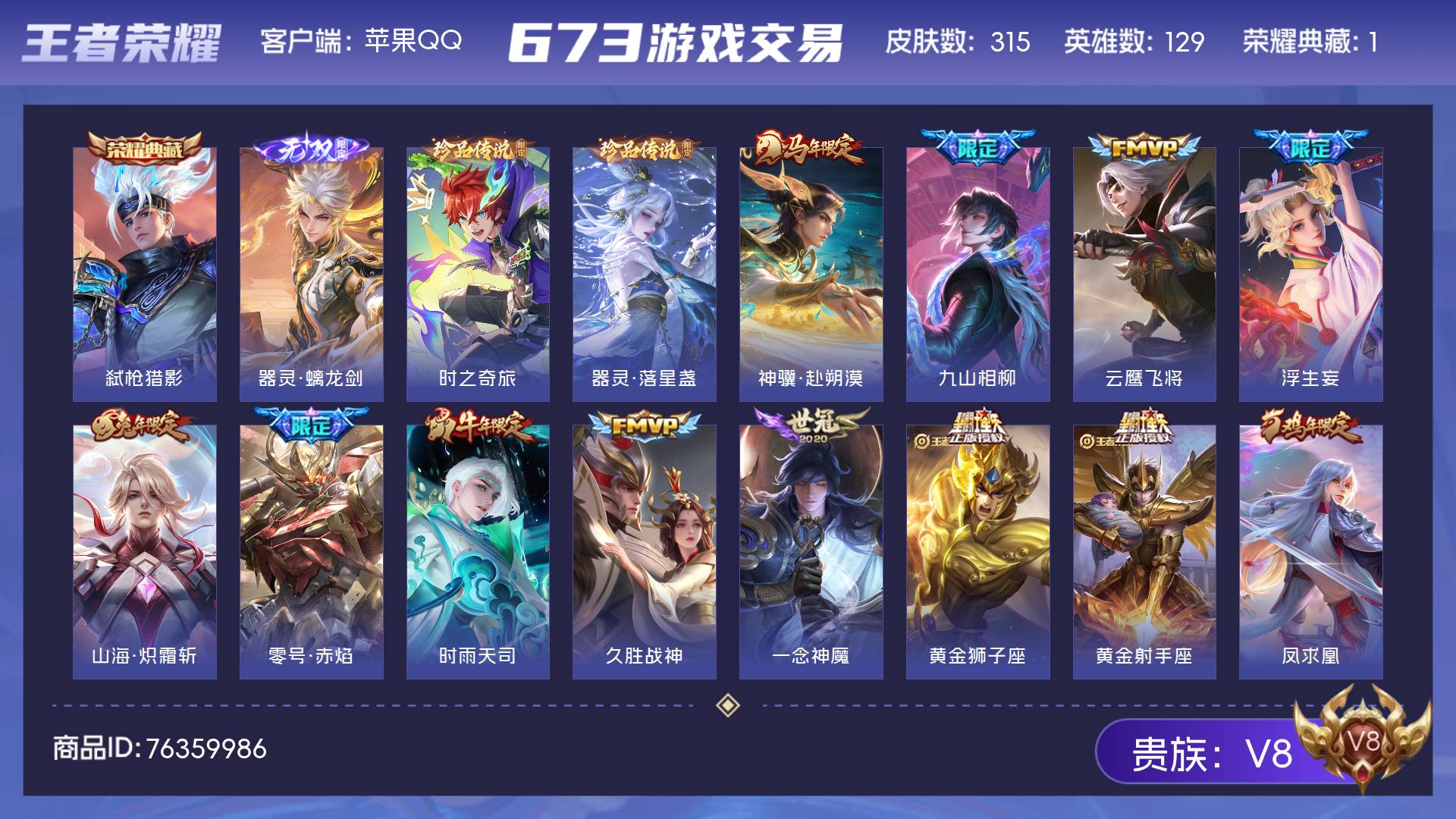 V8 皮肤315 英雄129 永恒钻石 荣耀典藏1 无双皮肤1 珍品传说2 星传说1 传说24