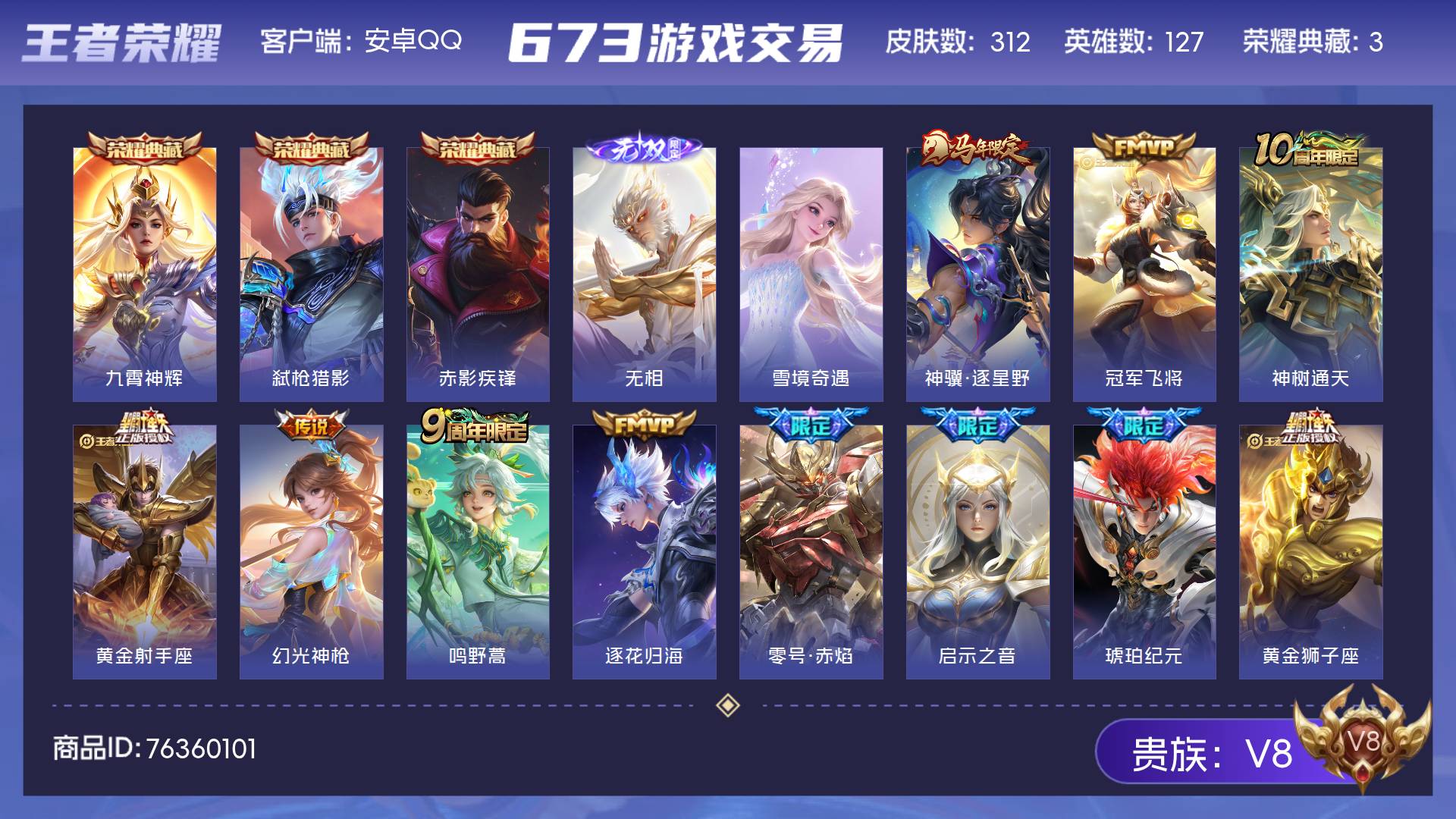 V8 皮肤312 英雄127 至尊星耀 荣耀典藏3 无双皮肤2 星传说1 传说26