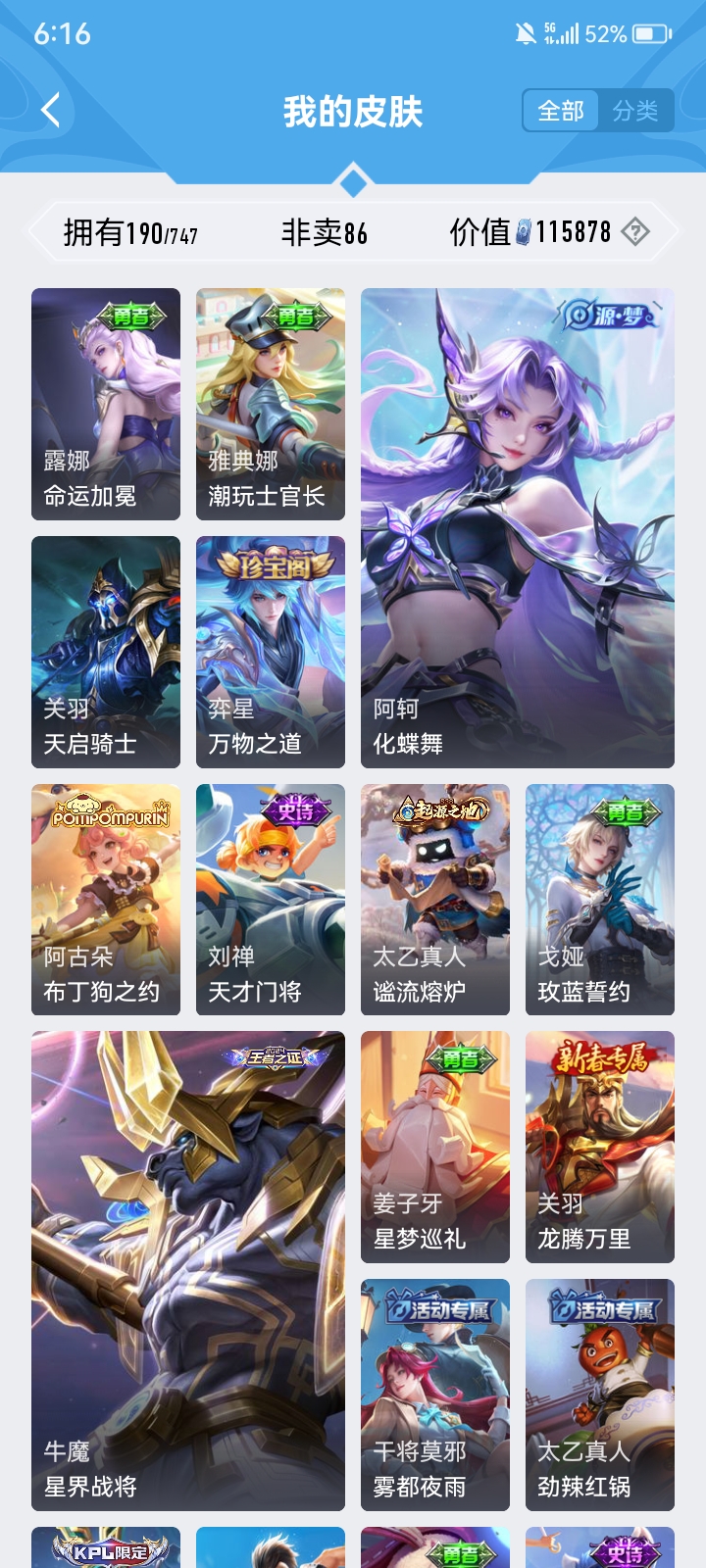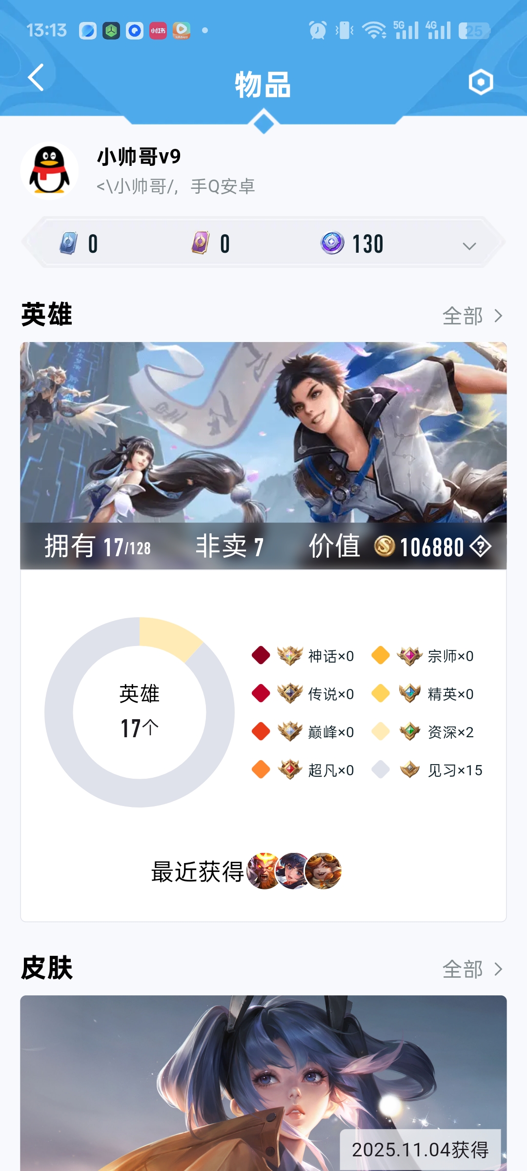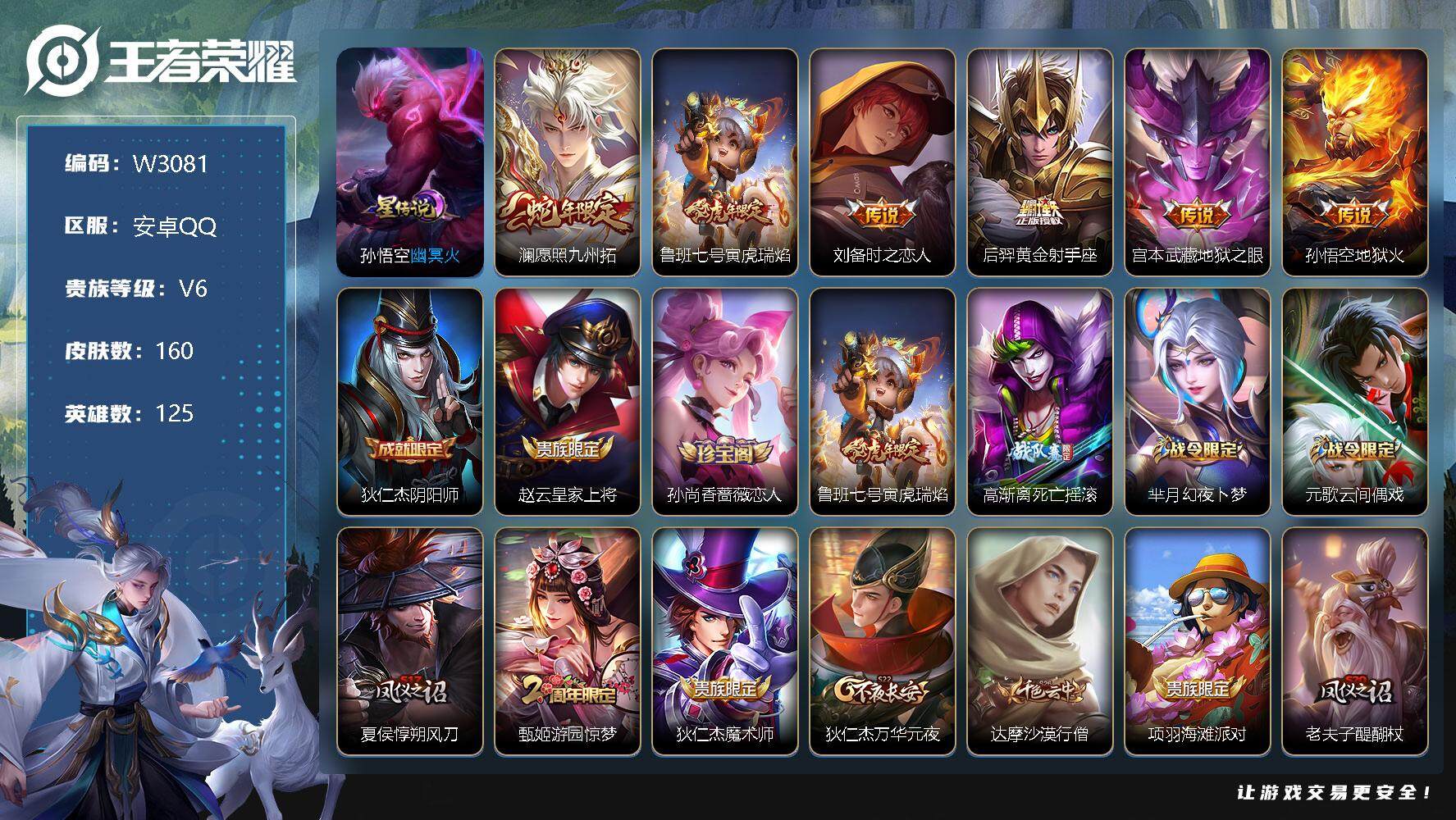 王者荣耀【安卓QQ】【W3081】安卓Q区-可二次-贵6-125英雄-160皮肤-6传说-42史诗