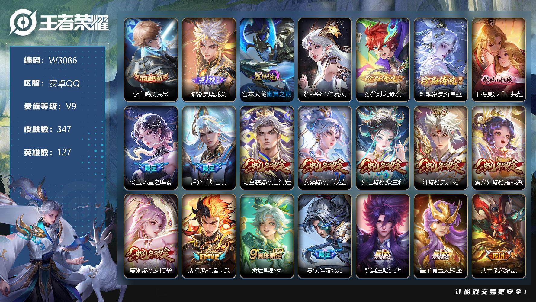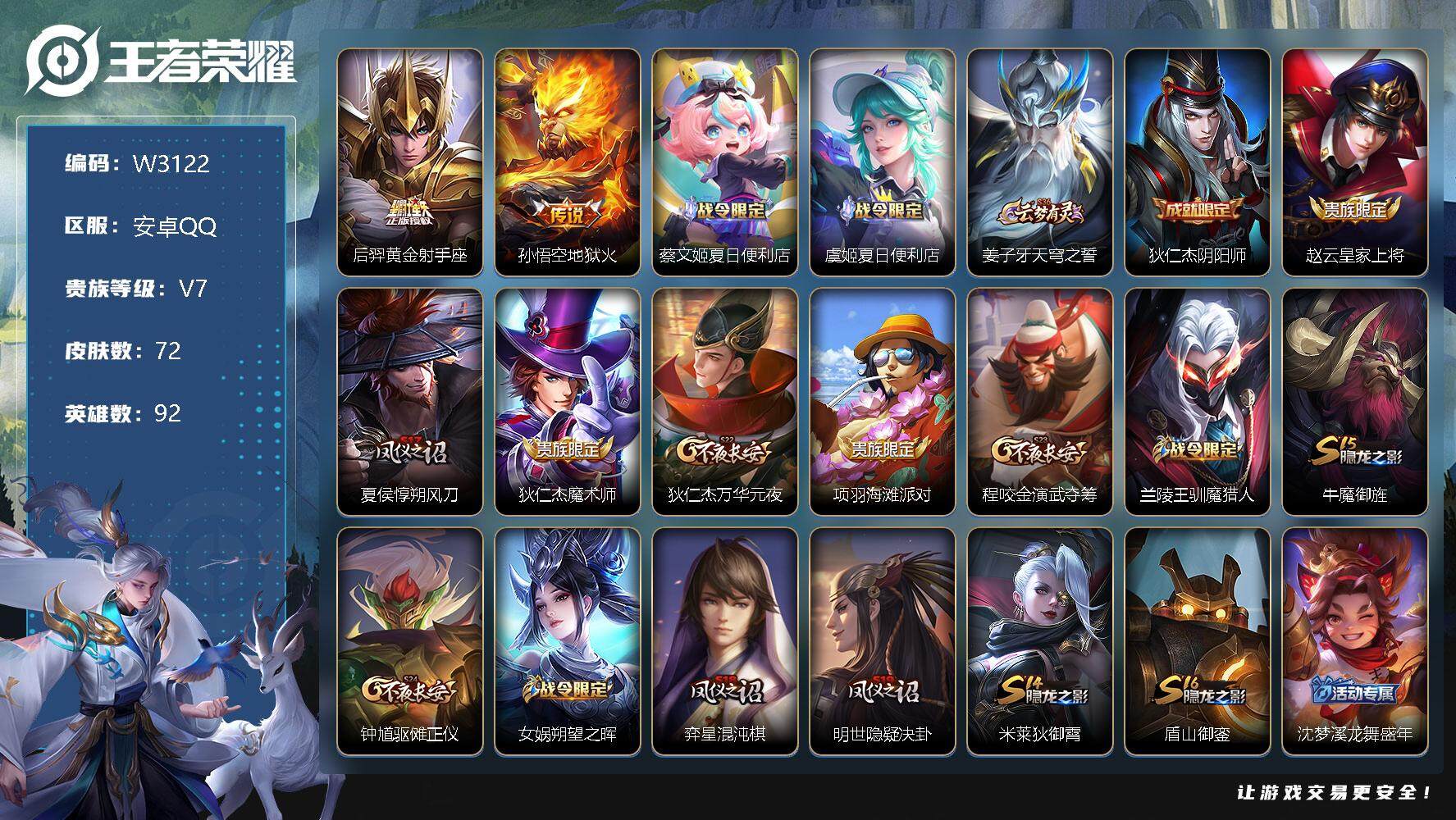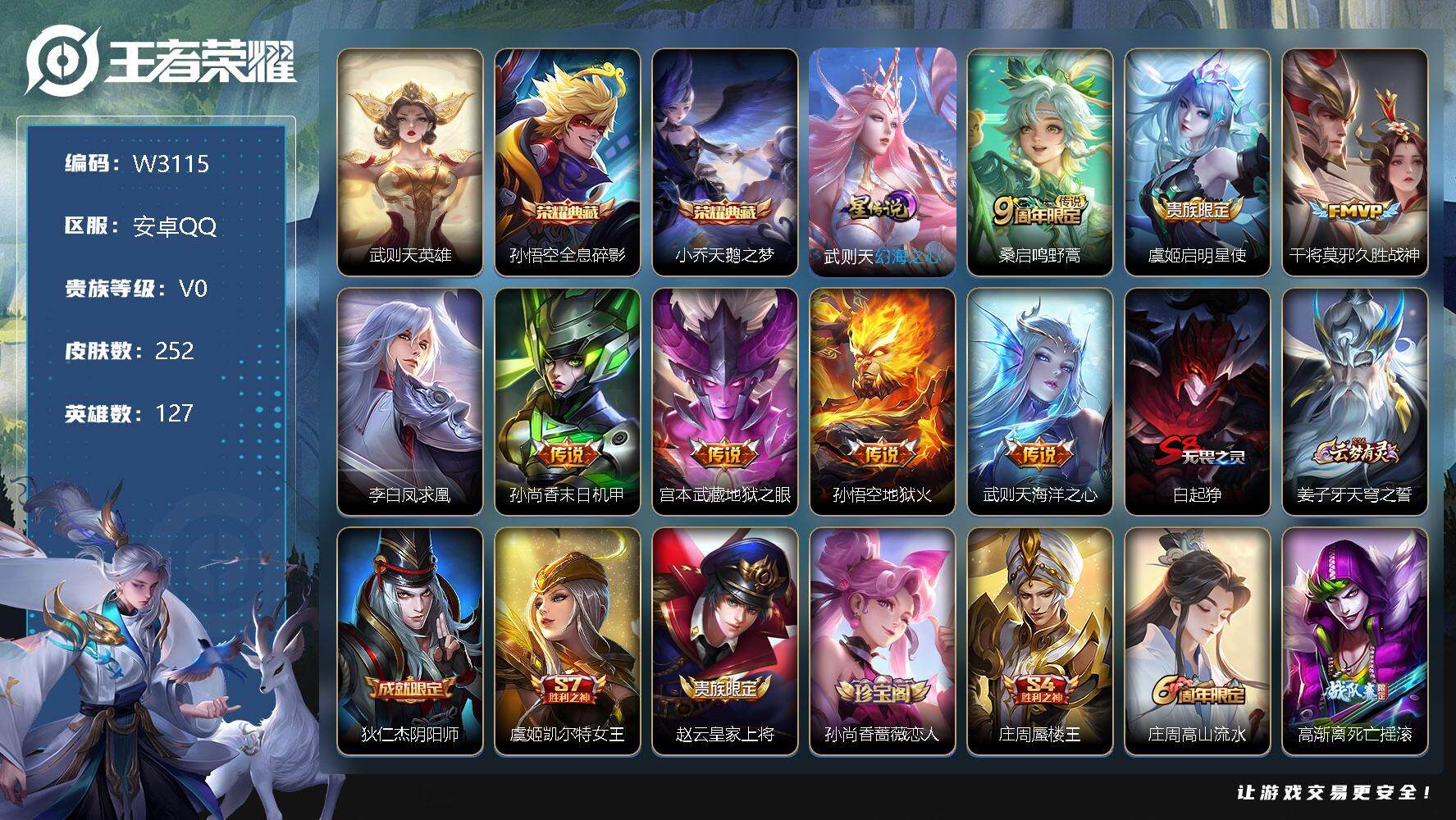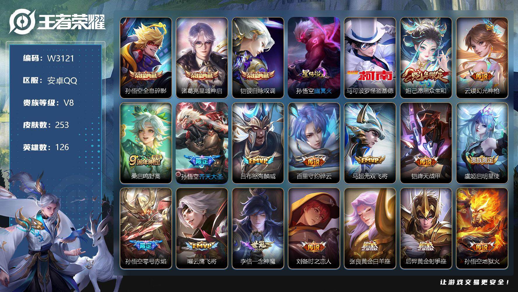 王者荣耀【安卓QQ】【W3121】安卓Q区-可二次-贵8-126英雄-253皮肤-3典藏-1珍品传