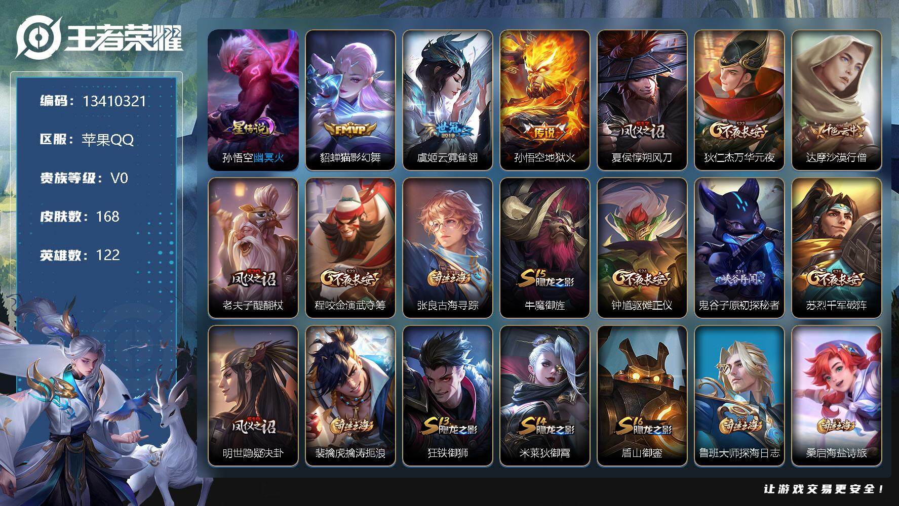 王者荣耀【苹果QQ】【13410321】[13410321]实名: 可修改 英雄数: 122 皮肤