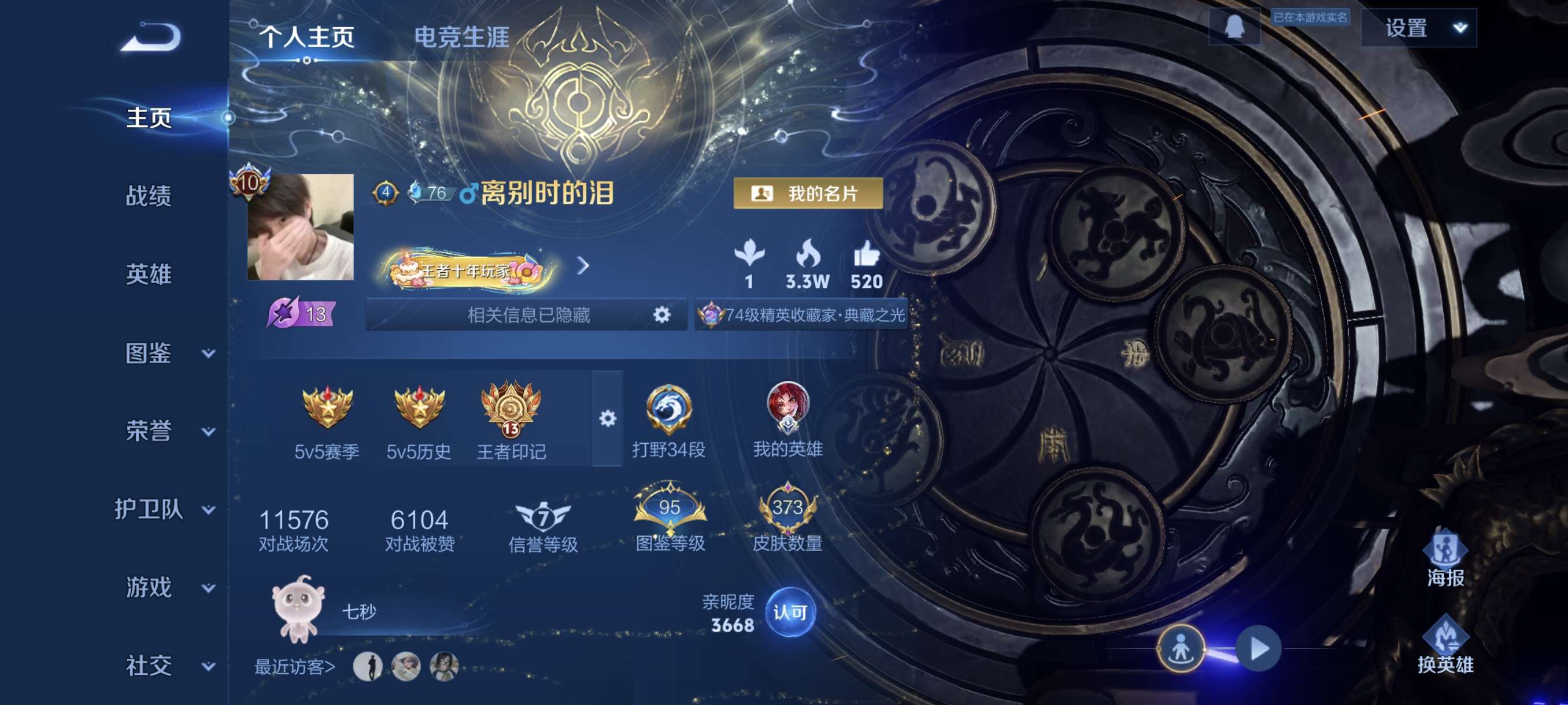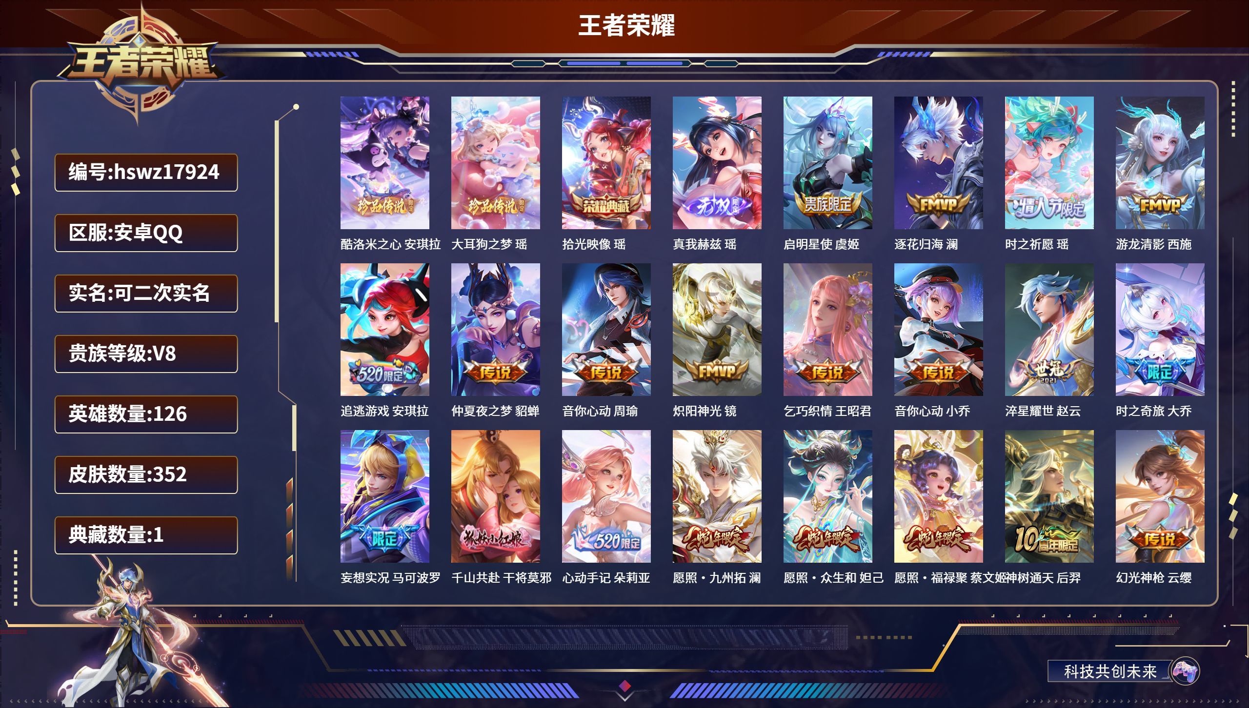 王者荣耀【安卓QQ】安卓QQ/荣耀王者/352皮肤/126英雄/1典藏/0珍品无双/1无双/2珍品传说/27传说/105