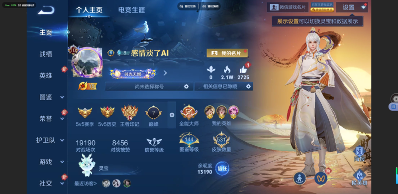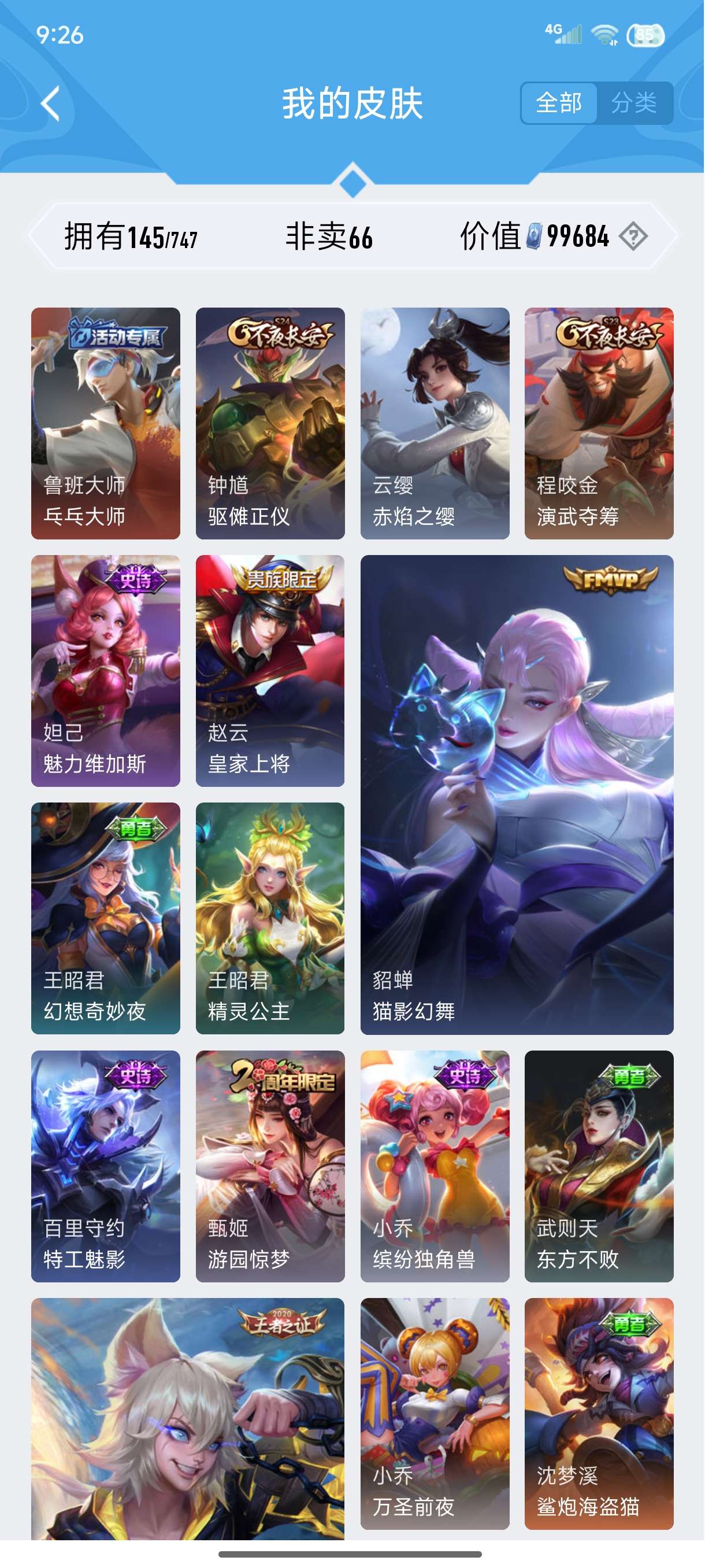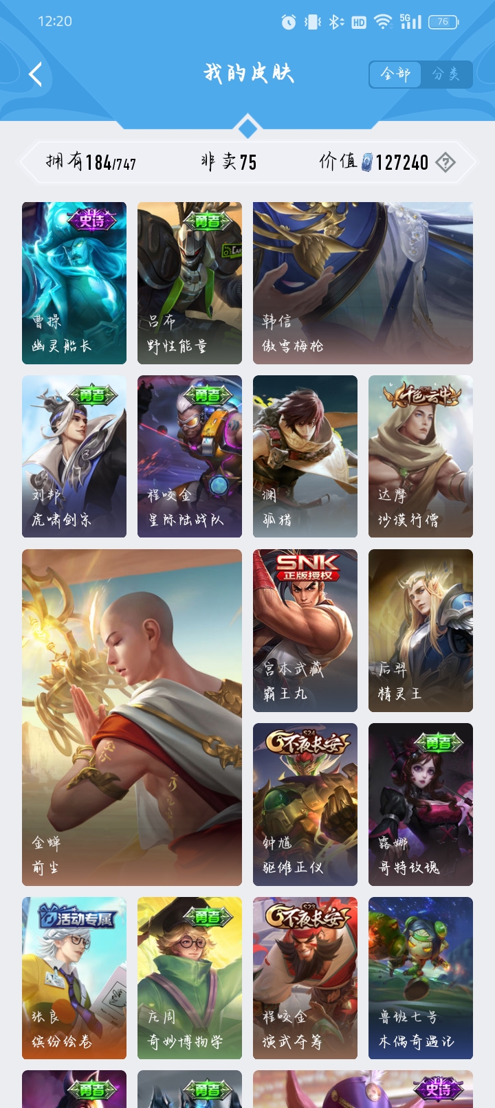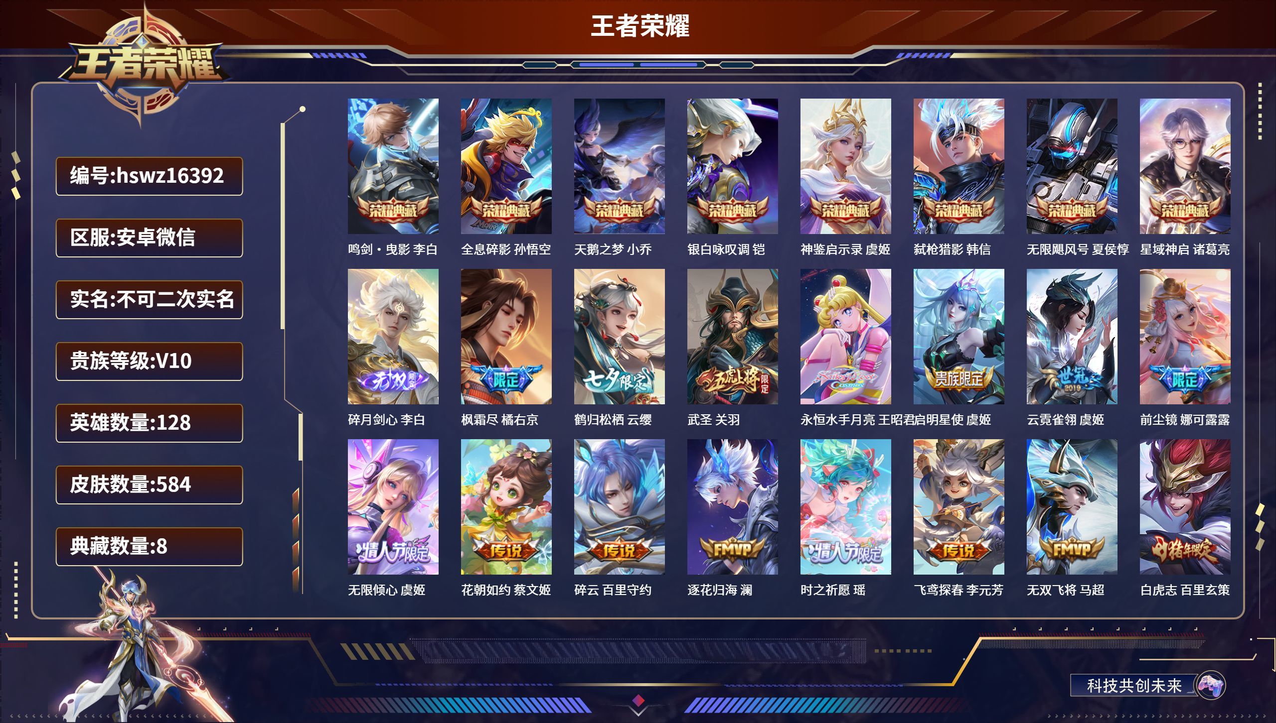 王者荣耀【安卓微信】安卓v/至尊星耀/584皮肤/128英雄/8典藏/0珍品无双/1无双/0珍品传说/93传说/208