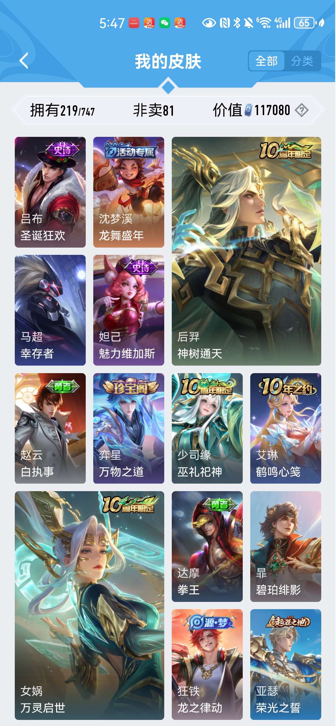 王者荣耀【安卓QQ】皮肤219,英雄127(没武则天),最强王者