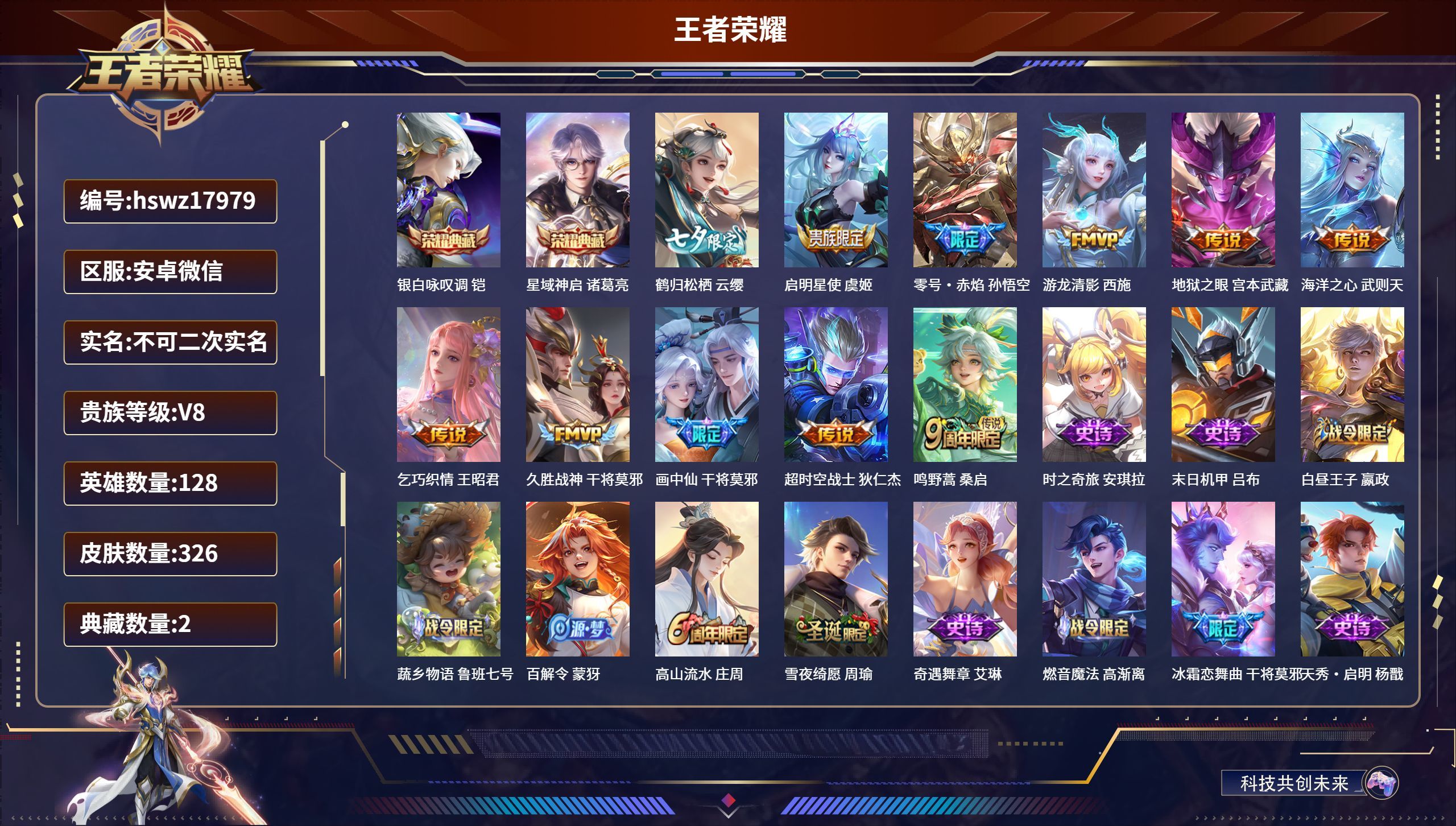 王者荣耀【安卓微信】安卓v/最强王者/326皮肤/128英雄/2典藏/0珍品无双/0无双/0珍品传说/11传说/90史
