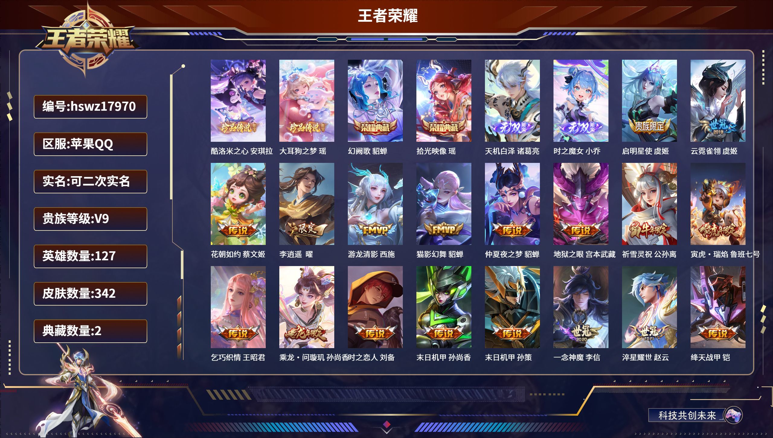 王者荣耀【苹果QQ】苹果QQ/永恒钻石/342皮肤/127英雄/2典藏/1珍品无双/2无双/2珍品传说/32传说/112