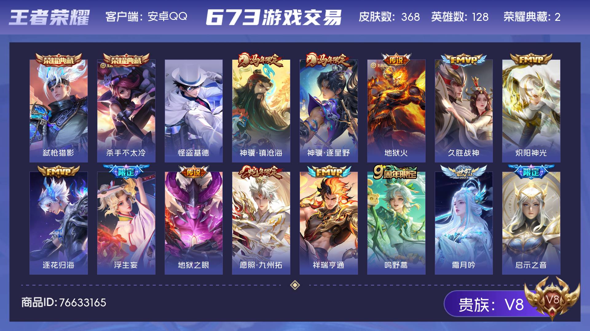 V8 皮肤368 英雄128 永恒钻石 荣耀典藏2 珍品传说1 星传说5 传说20