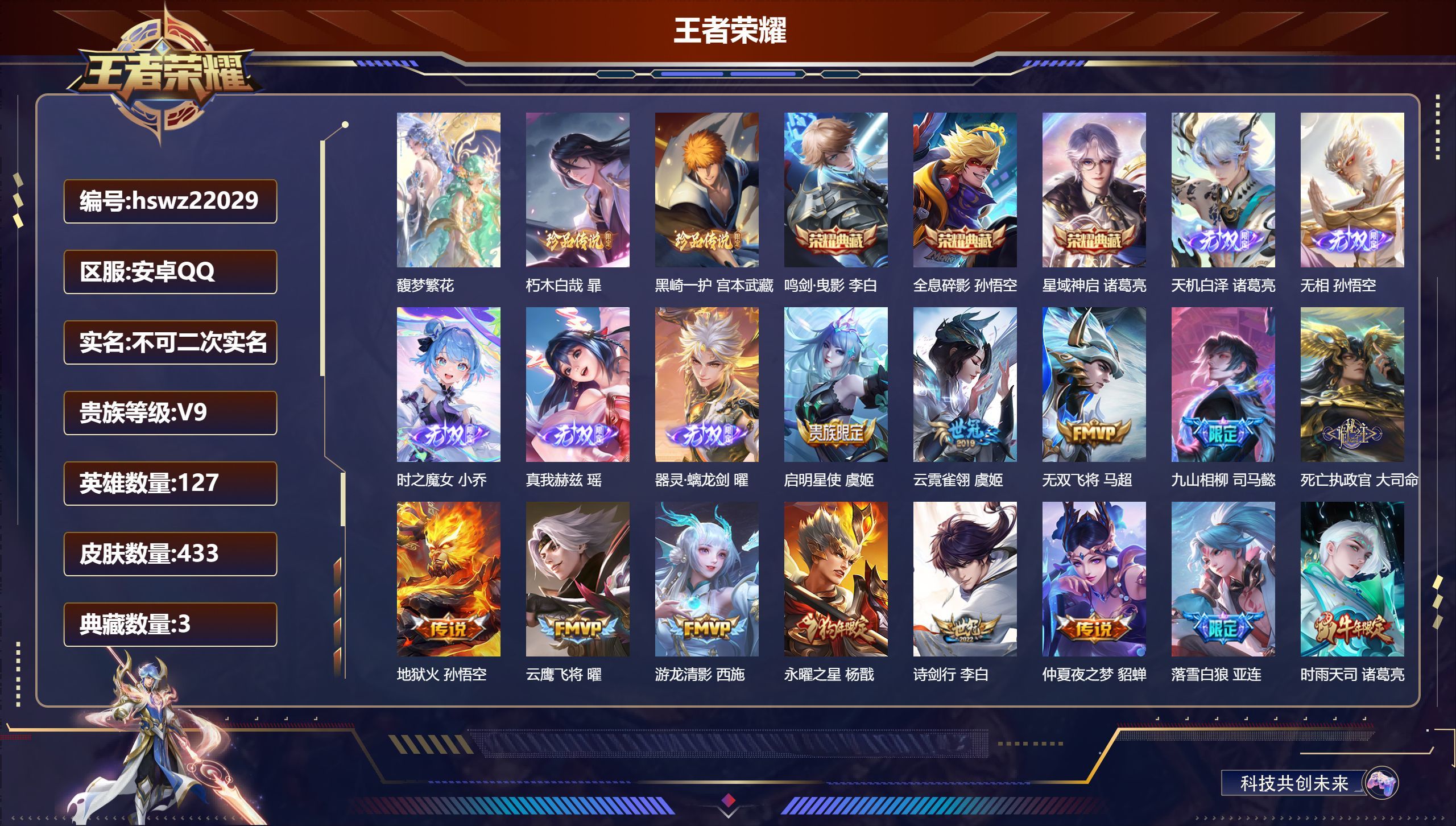 安卓QQ/永恒钻石/433皮肤/127英雄/3典藏/1珍品无双/5无双/2珍品传说/35传说/126