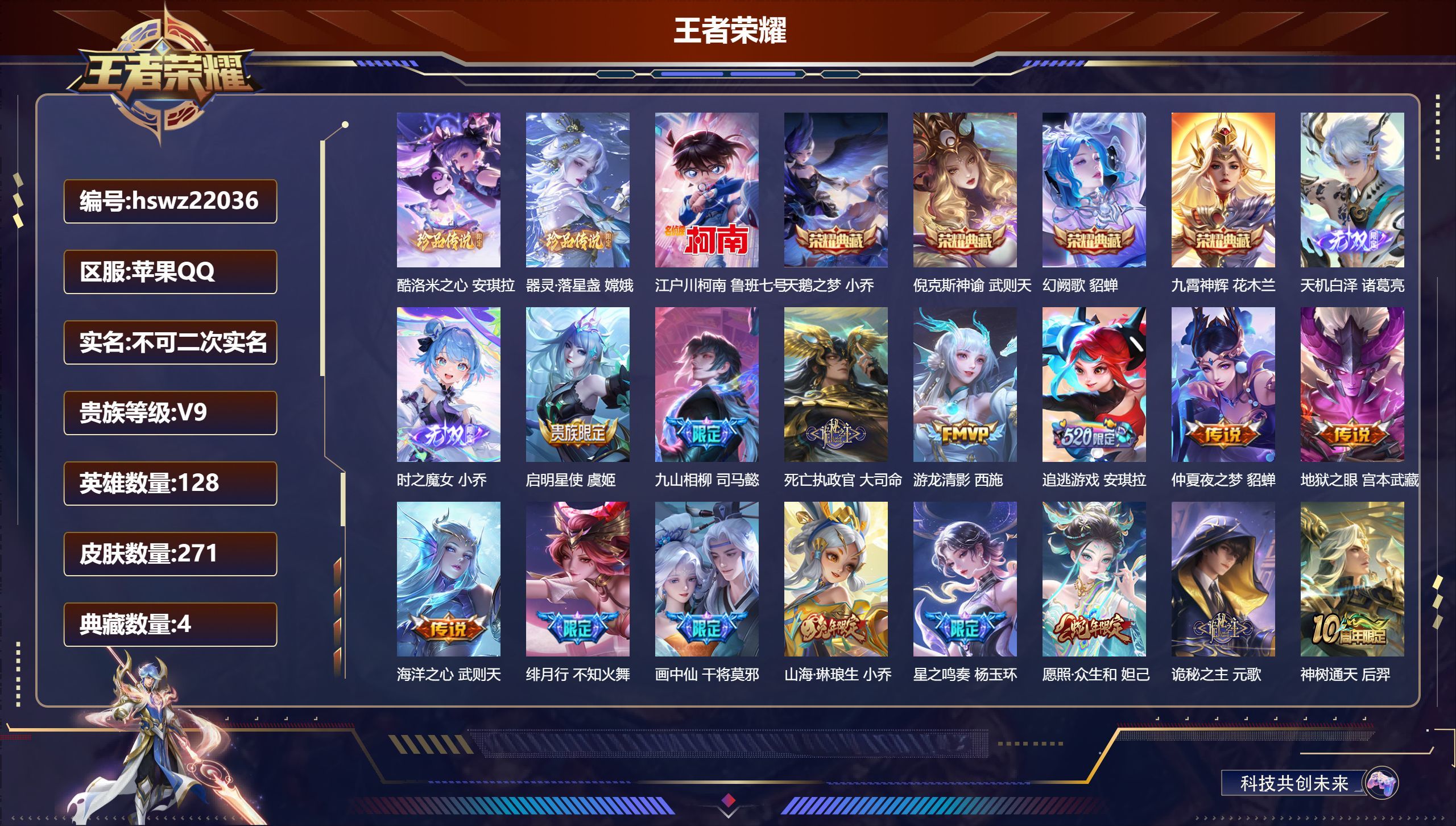 苹果QQ/至圣王者/271皮肤/128英雄/4典藏/0珍品无双/2无双/3珍品传说/21传说/91史