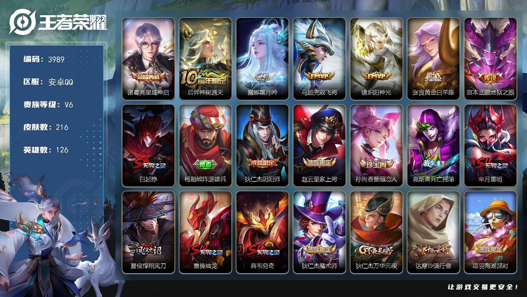 安卓Q-V6-最强王者段位-126英雄-216皮肤-1典藏皮肤-6传说-50史