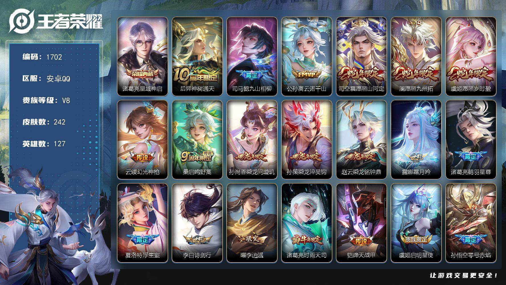 安卓Q-V8-至尊星耀IV段位-127英雄-242皮肤-1典藏皮肤-24传说-