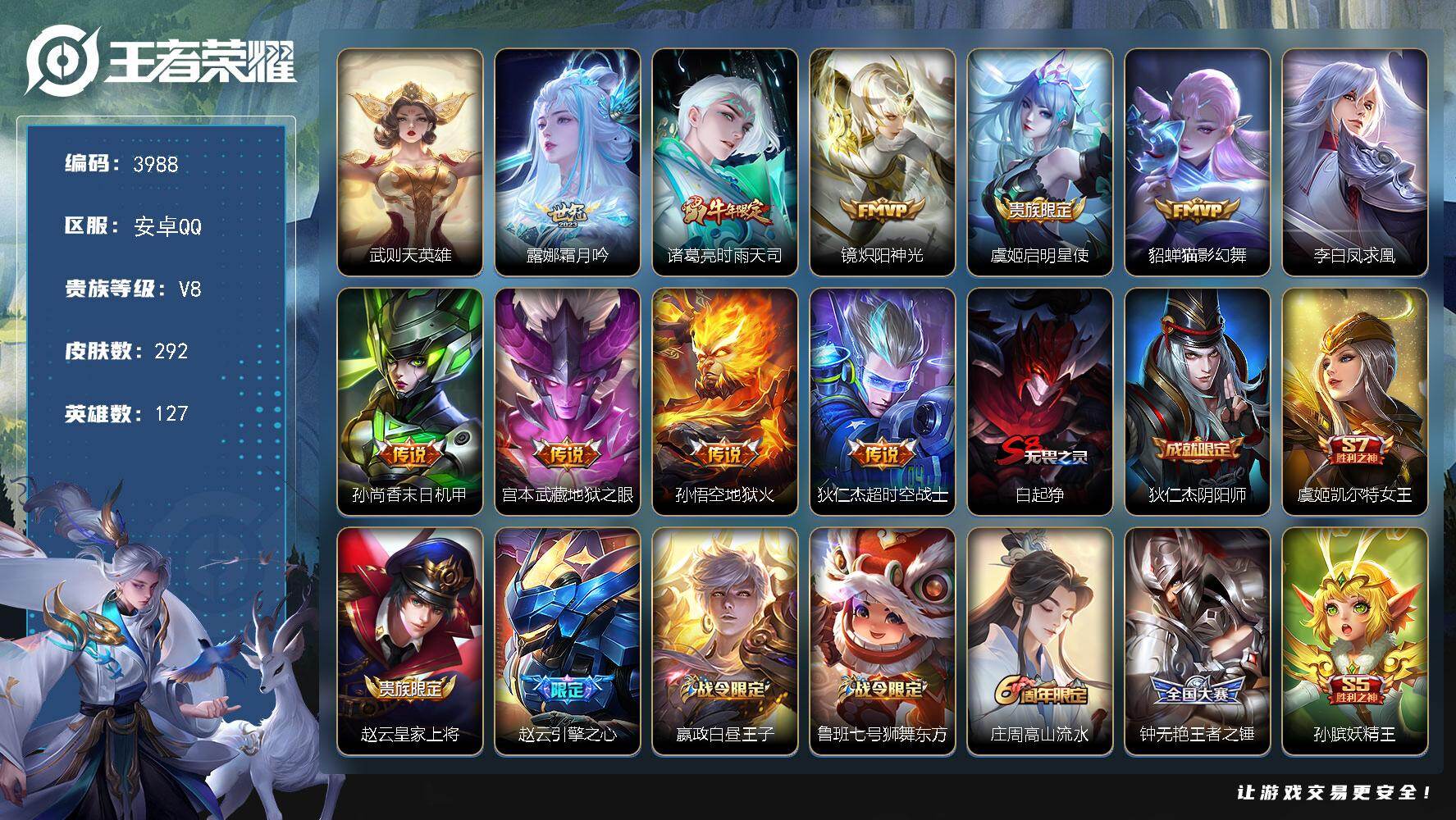 安卓Q-V8-永恒钻石V段位-127英雄-292皮肤-1典藏英雄-10传说-7