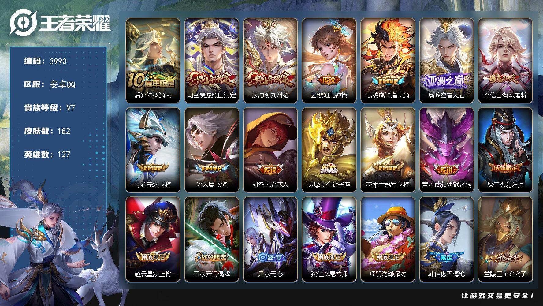 安卓Q-V7-至尊星耀V段位-127英雄-182皮肤-13传说-46史诗【英