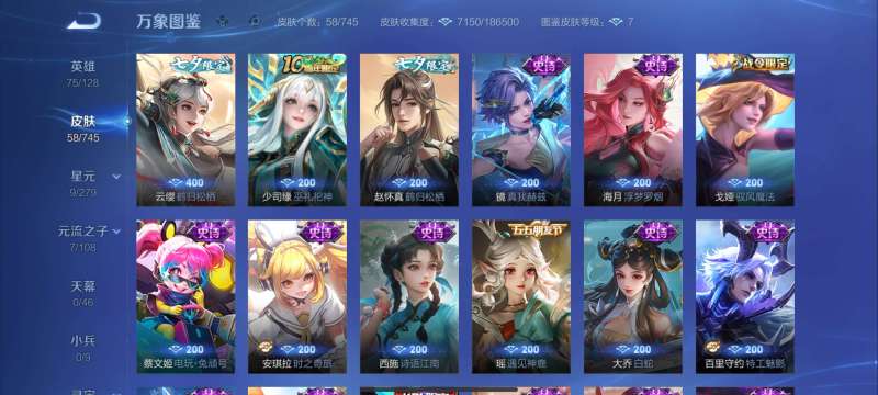 皮肤600 英雄128 荣耀黄金 荣耀典藏6 珍品无双1 无双皮肤12 珍品传说9 传说101 其他皮肤225-