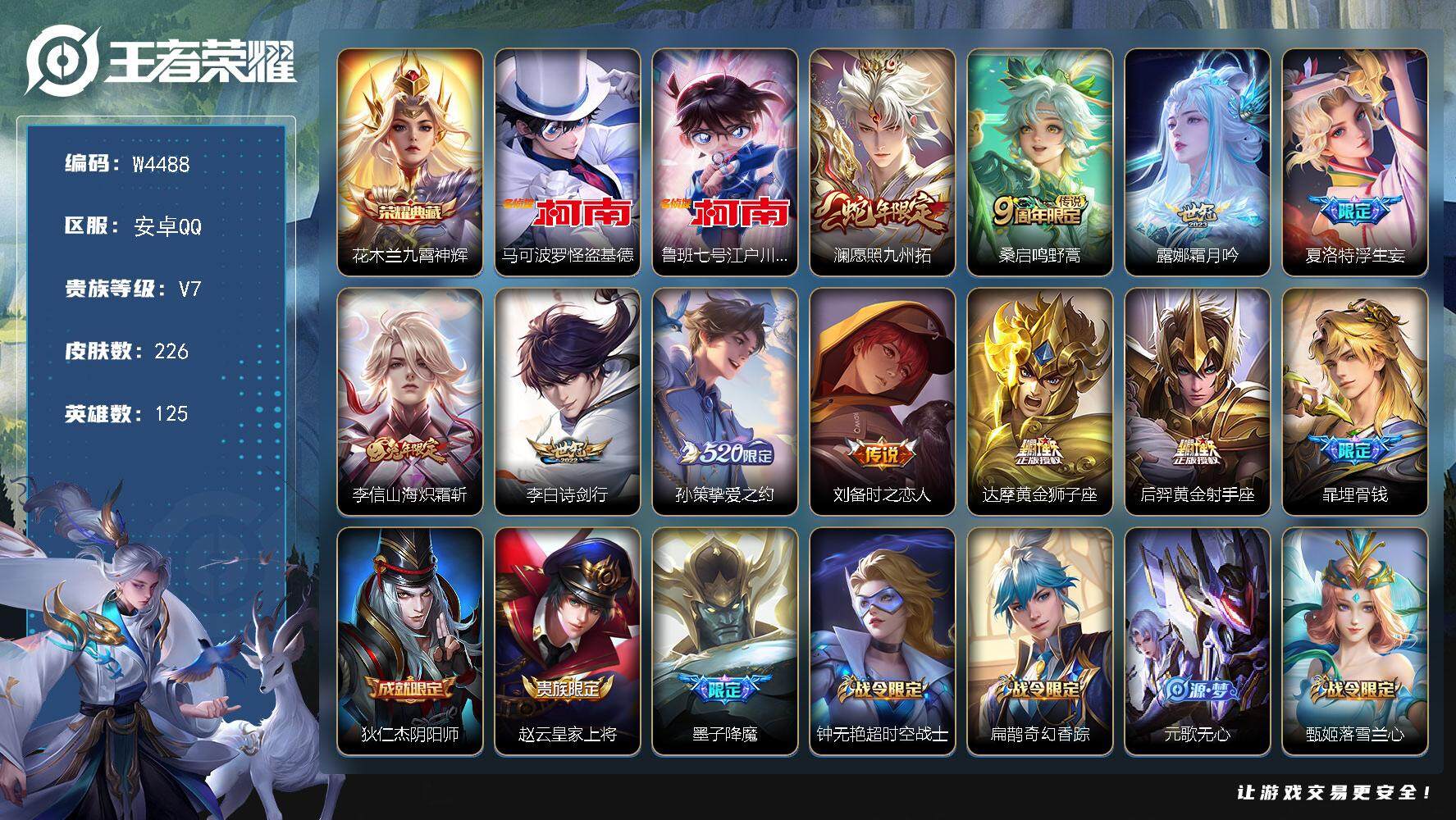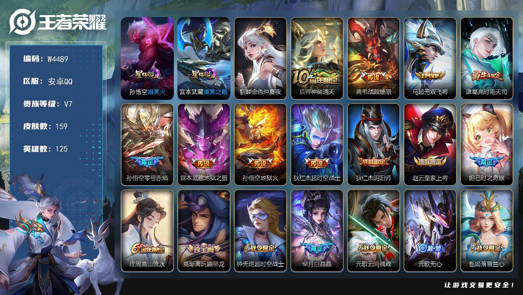 安卓QQ/无双王者/355皮肤/127英雄/3典藏/0珍品无双/2无双/1珍品传说/23传说/98史