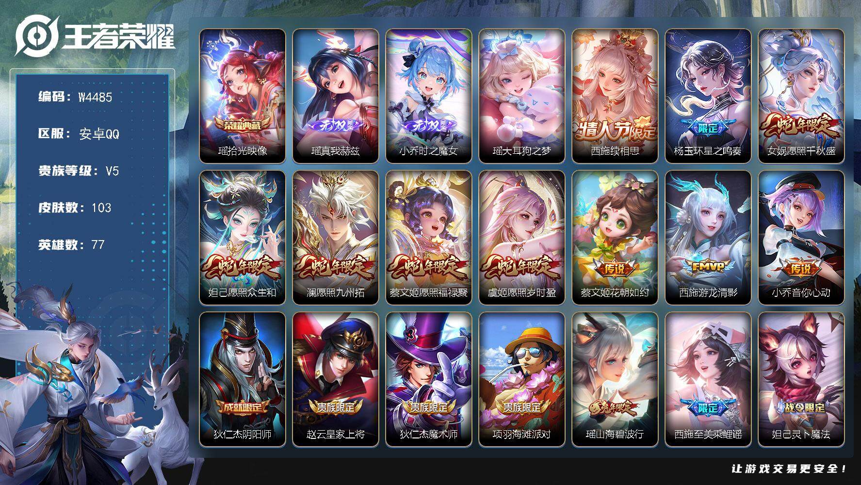 皮肤103 英雄77 永恒钻石 荣耀典藏1 无双皮肤2 珍品传说2 传说10 其他皮肤25-