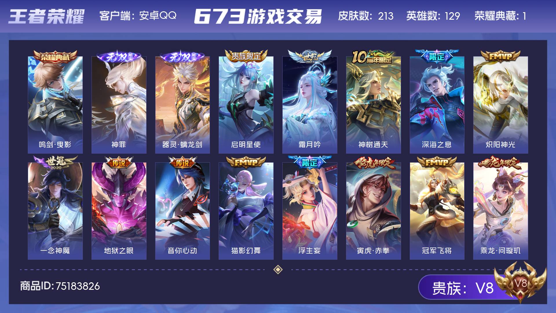 V8 皮肤213 英雄129 永恒钻石 荣耀典藏1 无双皮肤2 星传说1 传说20 其他皮肤195