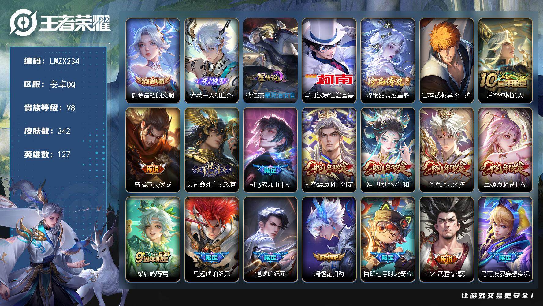 可二次【特价出售/店主推荐】安卓Q-V8-至尊星耀II段位-127英雄-342