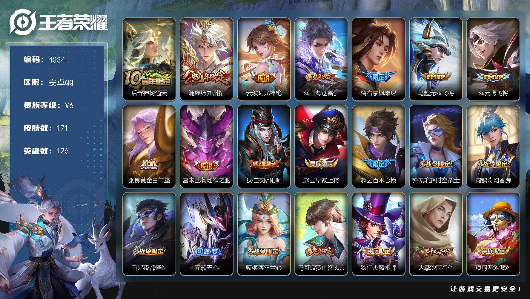 安卓Q-V6-永恒钻石II段位-126英雄-171皮肤-9传说-44史诗【英