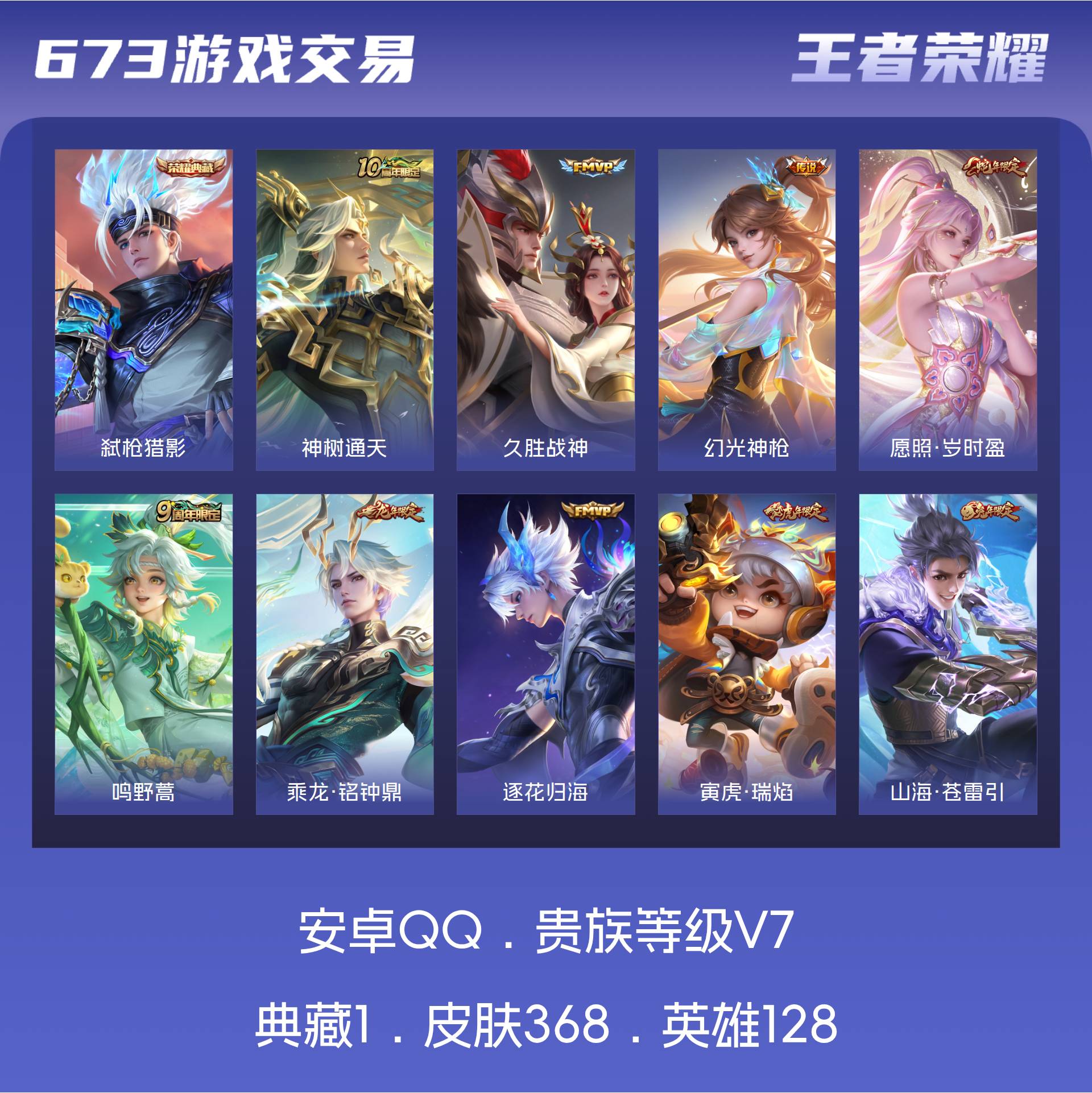 可二次 V7 皮肤368 英雄128 绝世王者 荣耀典藏1 传说10 星元1