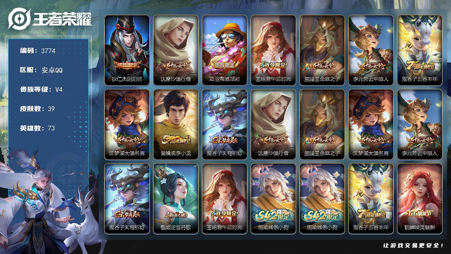 【特价小号】安卓Q-V4-永恒钻石V段位-73英雄-39皮肤-8史诗【限定皮