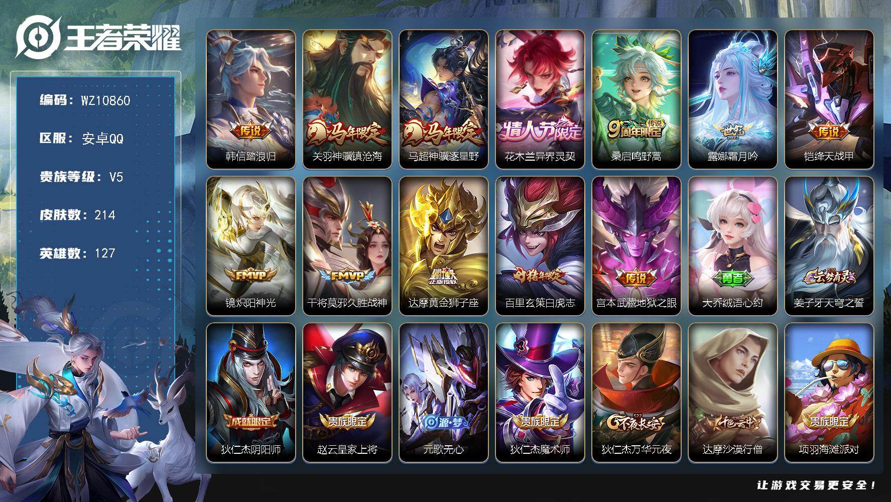 安卓Q-V5-至尊星耀IV段位-127英雄-214皮肤-12传说-49史诗【