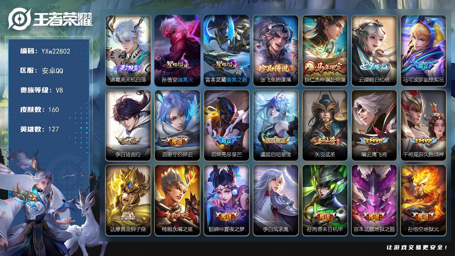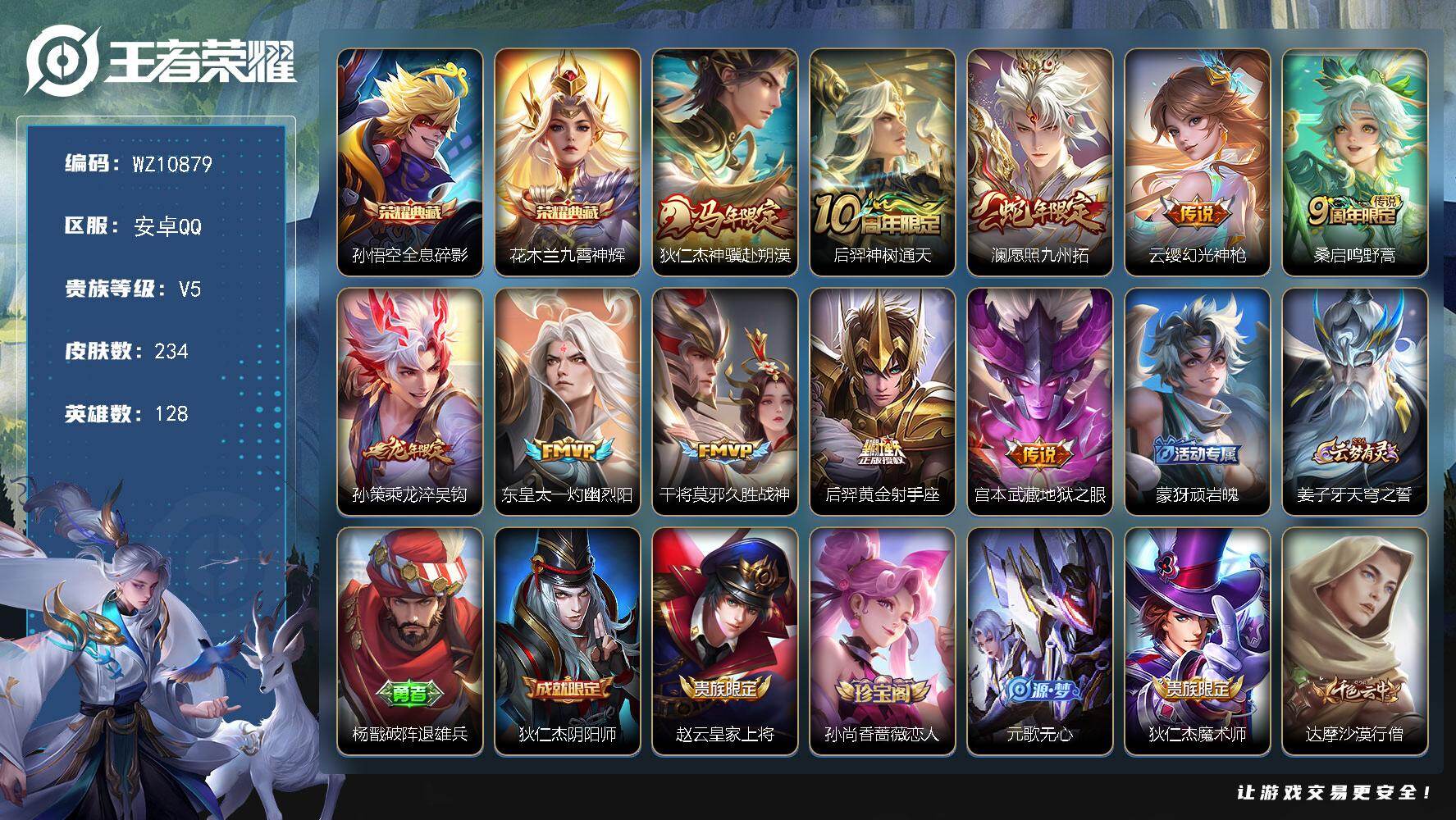 安卓Q-V5-永恒钻石II段位-128英雄-234皮肤-2典藏皮肤-10传说-