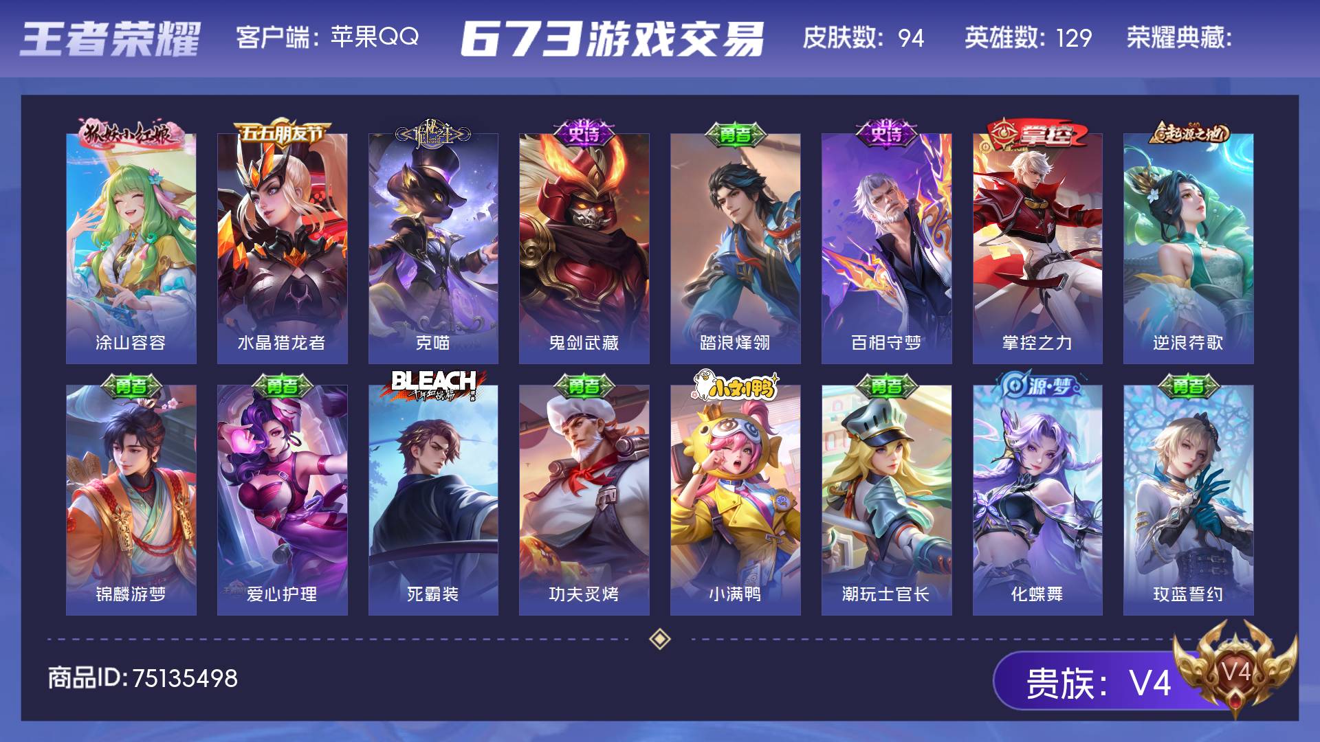 V4 皮肤94 英雄129 至尊星耀 其他皮肤99