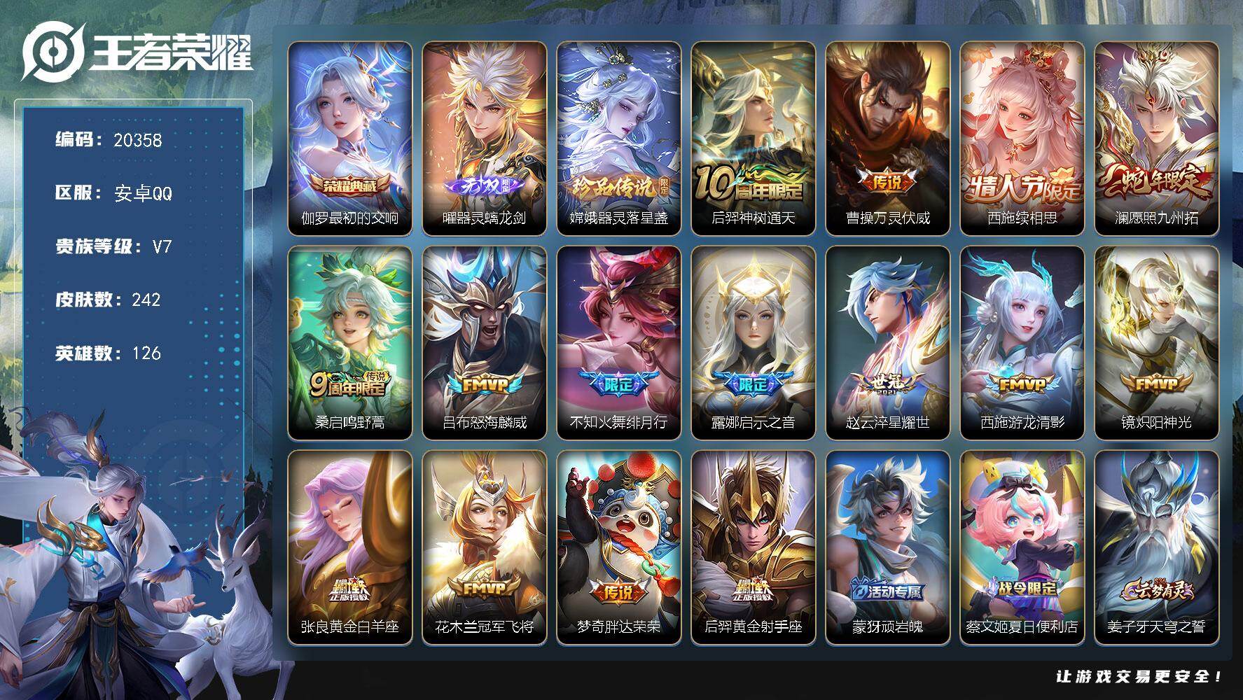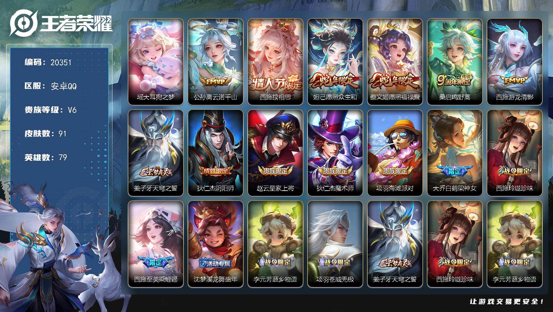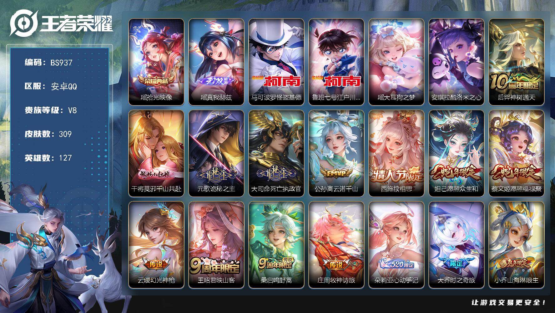 安卓Q-V8-瑶全皮!西施全皮!女号 妹子号!309皮肤 1典藏 1无双 4珍