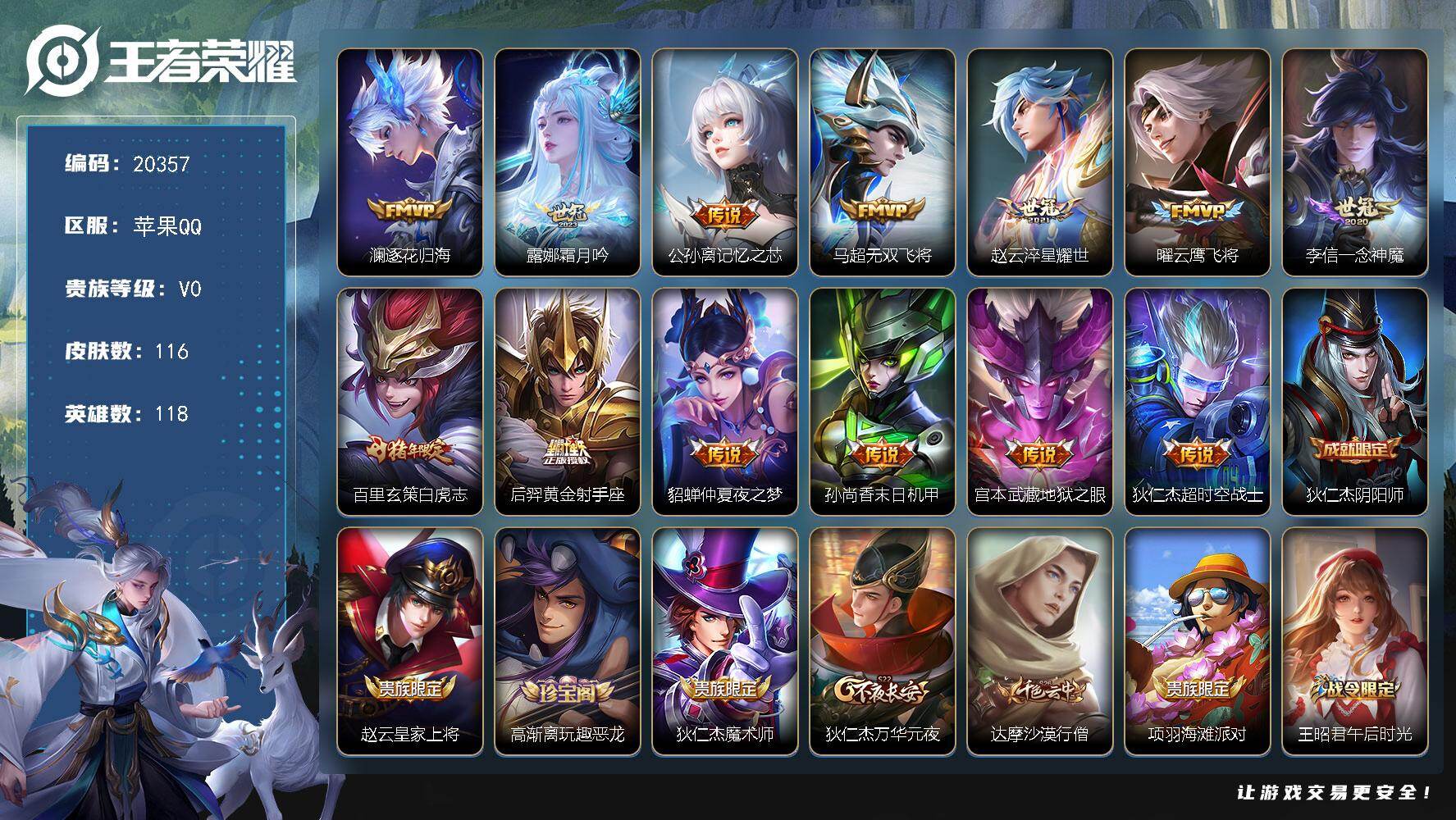 苹果Q-V5-最强王者段位-35英雄-31皮肤-1无双-1传说-10史诗【无
