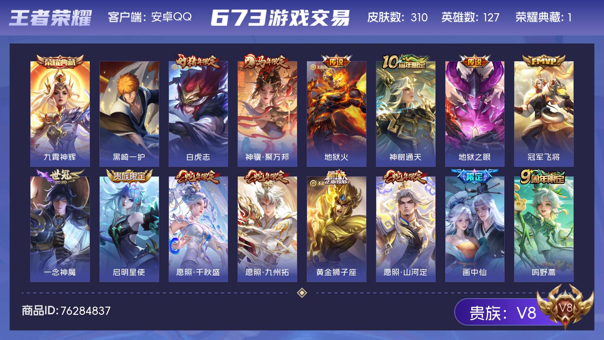 V8 皮肤310 英雄127 无双王者 荣耀典藏1 珍品传说1 星传说5 传说23