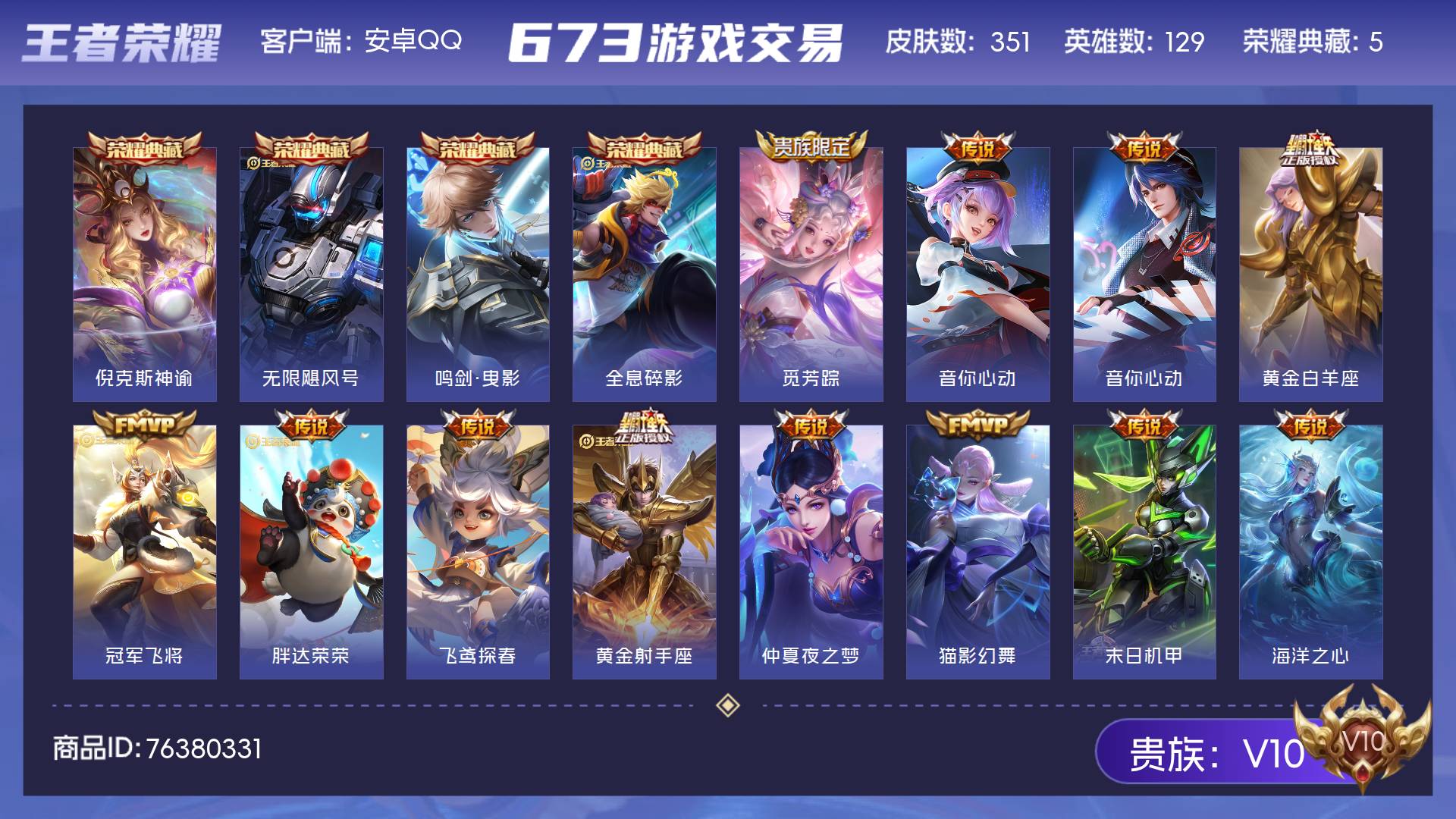 V10 皮肤351 英雄129 永恒钻石 荣耀典藏5 传说30