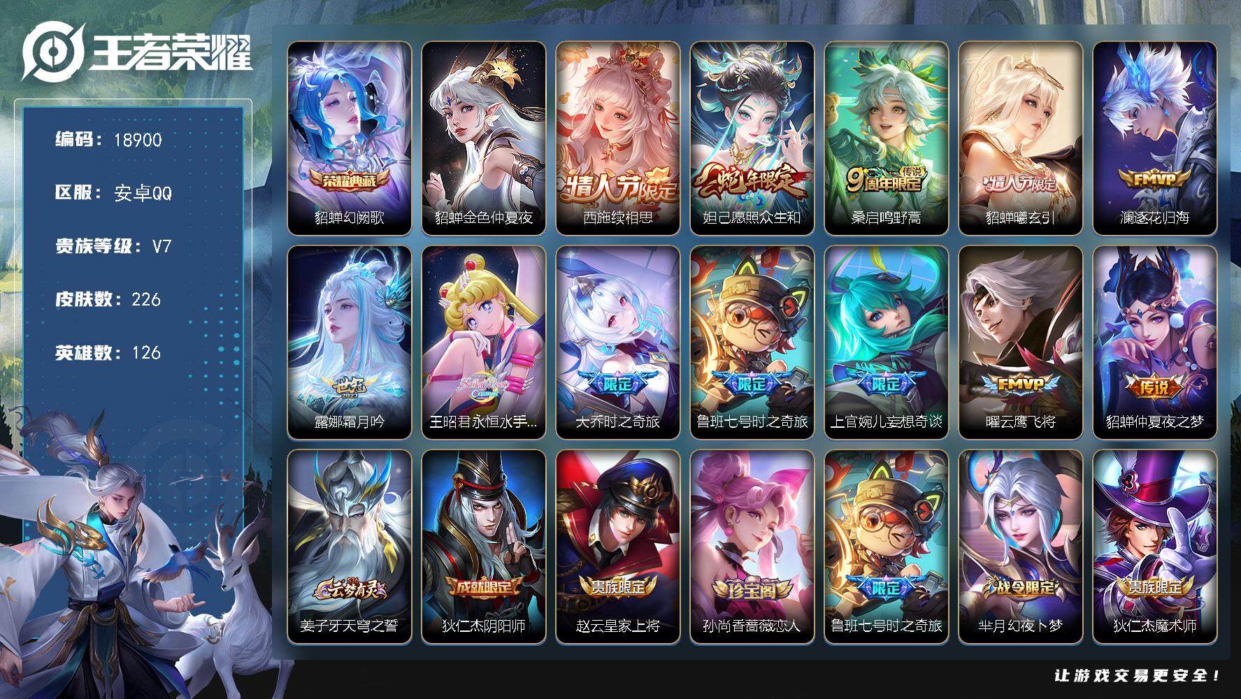 安卓QQ/至尊星耀/286皮肤/126英雄/1典藏/0珍品无双/1无双/4珍品传说/19传说/76史
