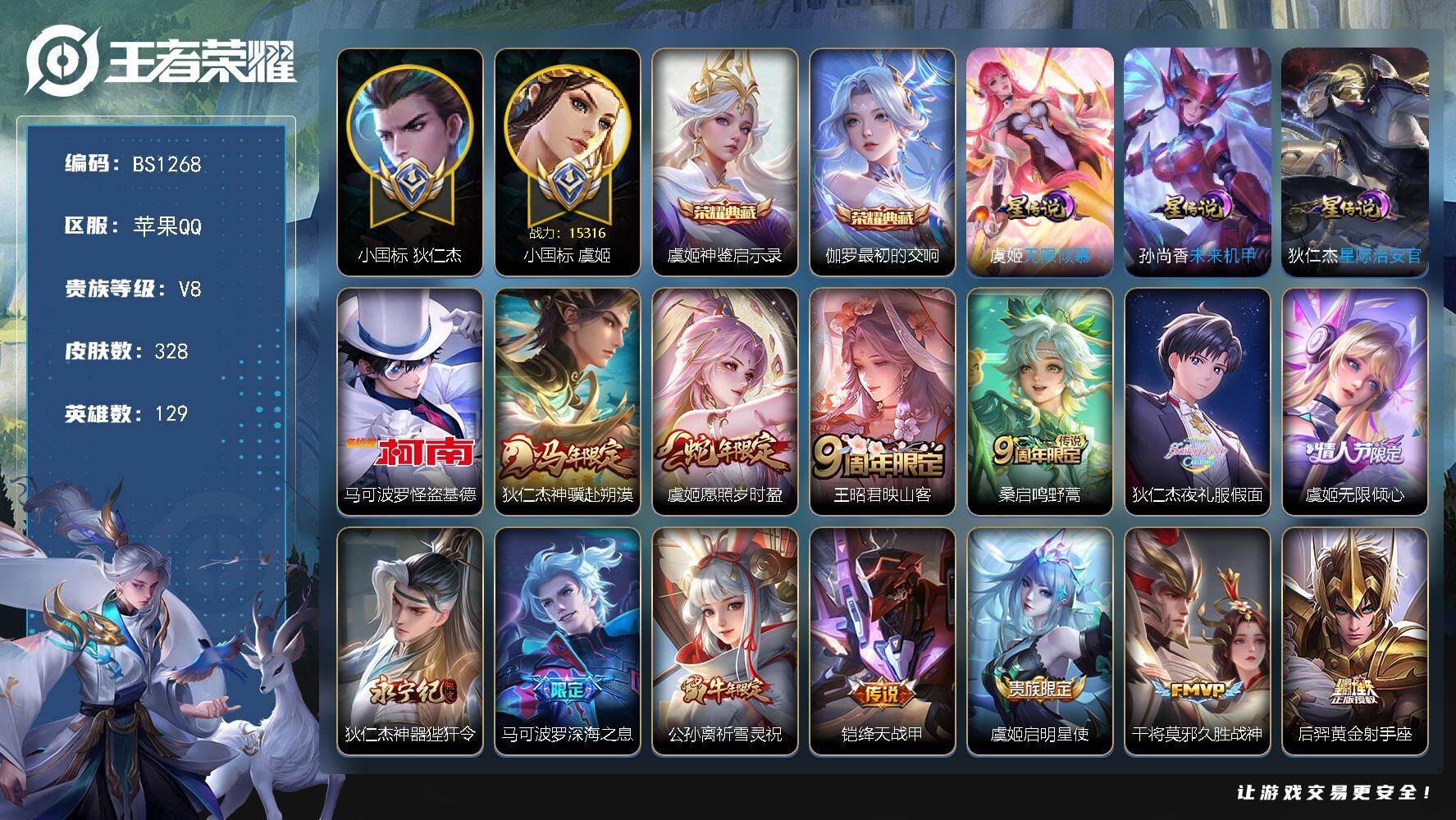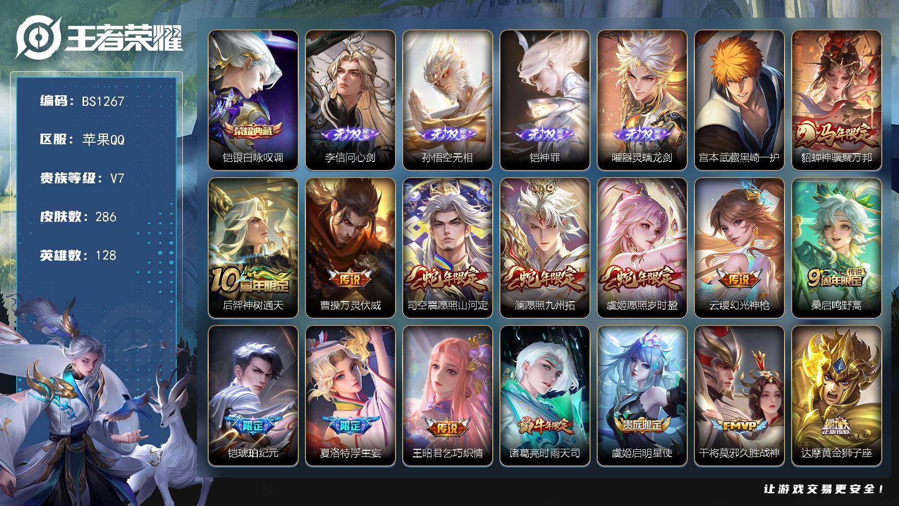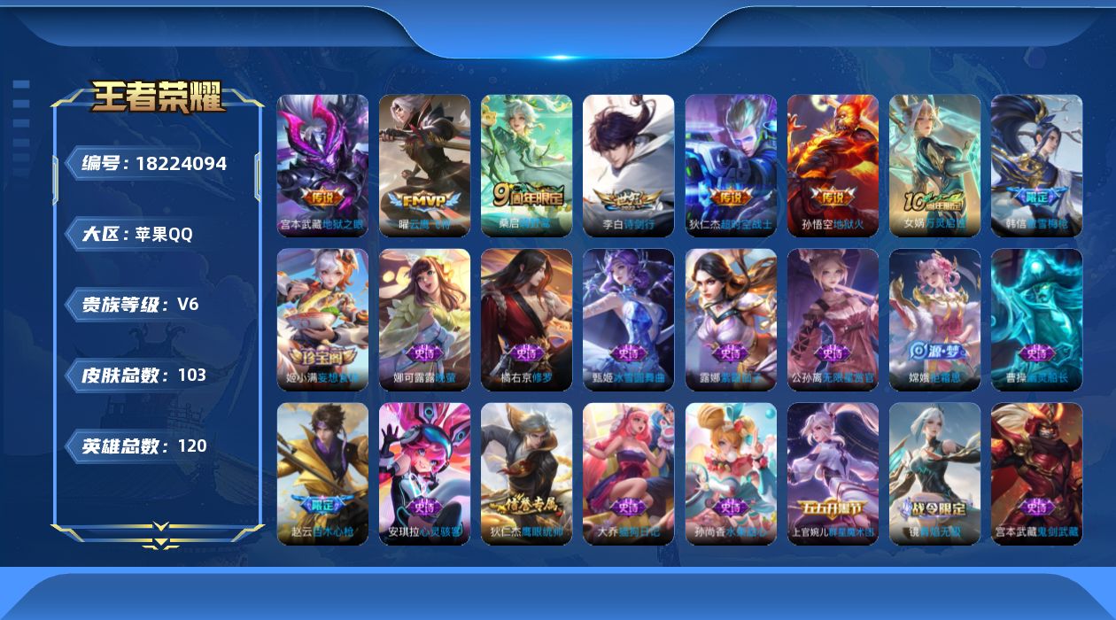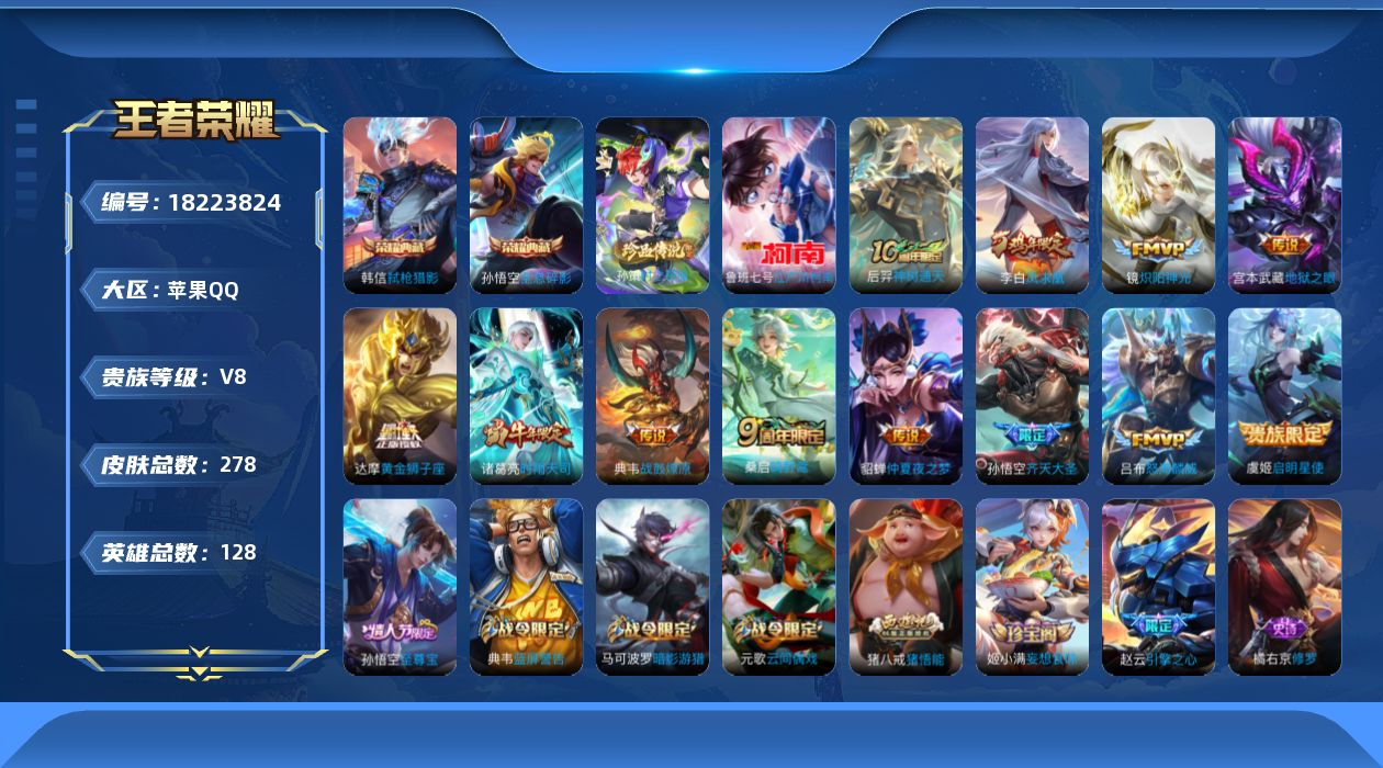 苹果Q-V7-至尊星耀IV段位-128英雄-286皮肤-1典藏皮肤-4无双-1