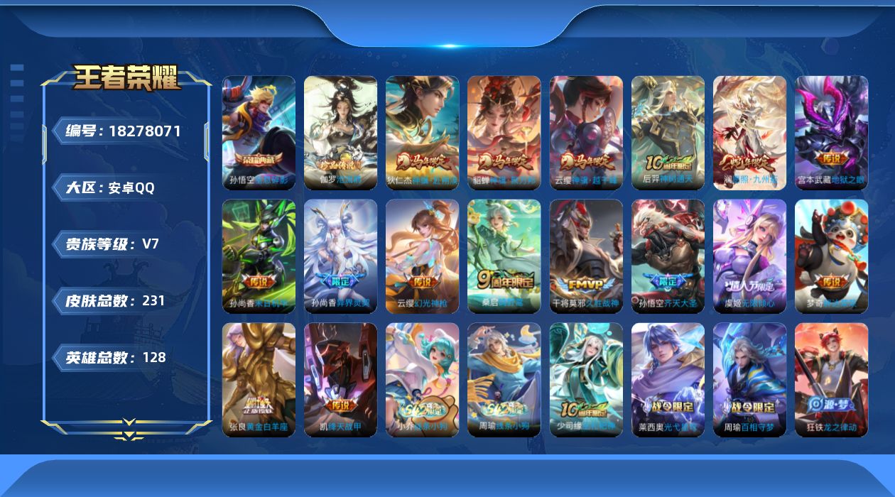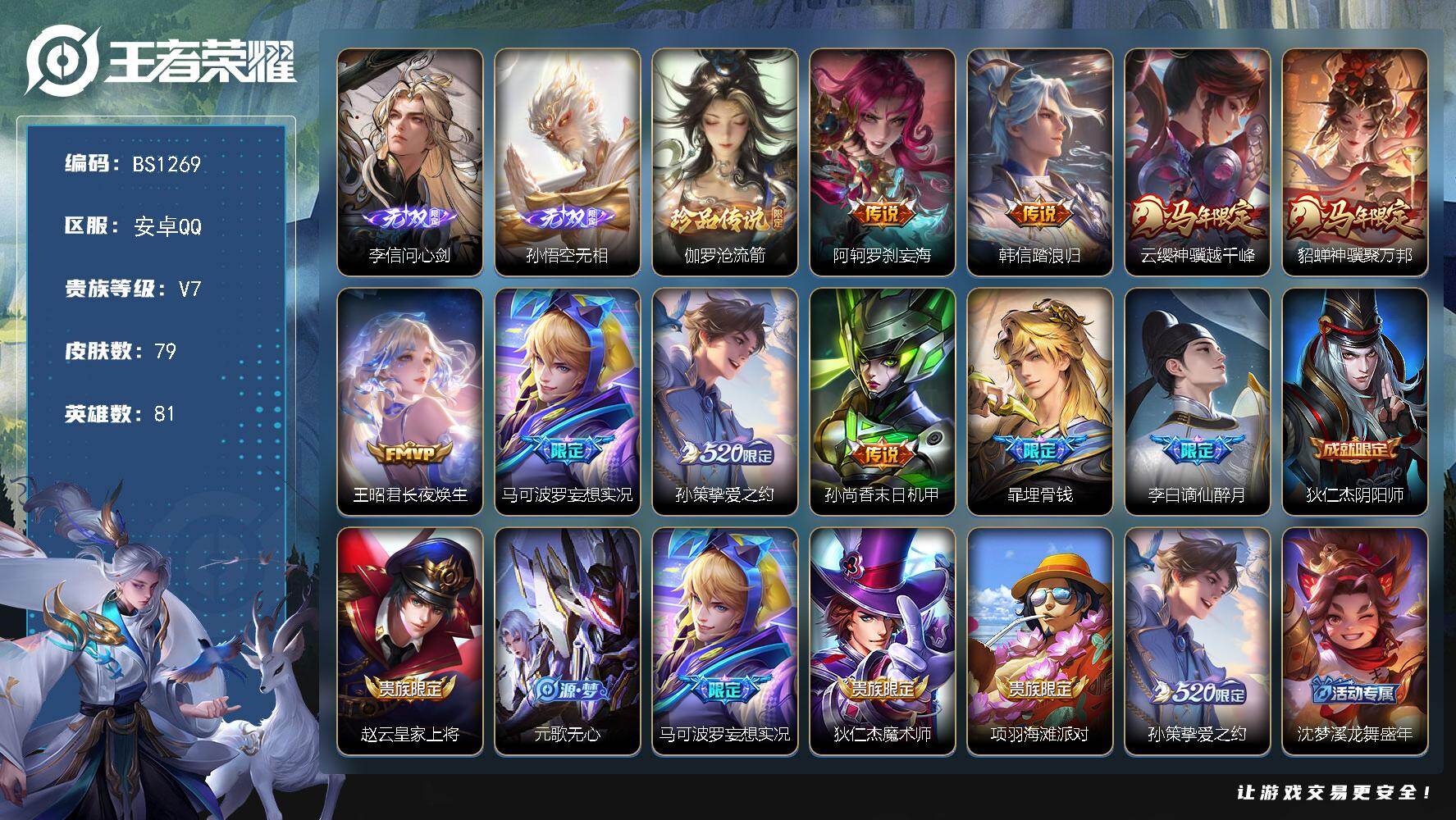 安卓Q-V7-永恒钻石I段位-81英雄-79皮肤-2无双-1珍品传说-8传说-