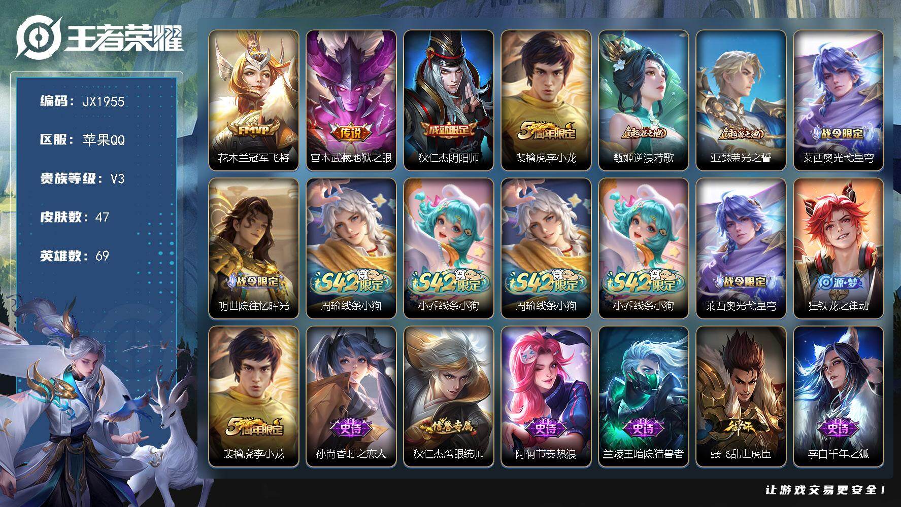 【JX1955】贵族3/皮肤47/传说2/史诗16/英雄69/花木兰-冠军飞将