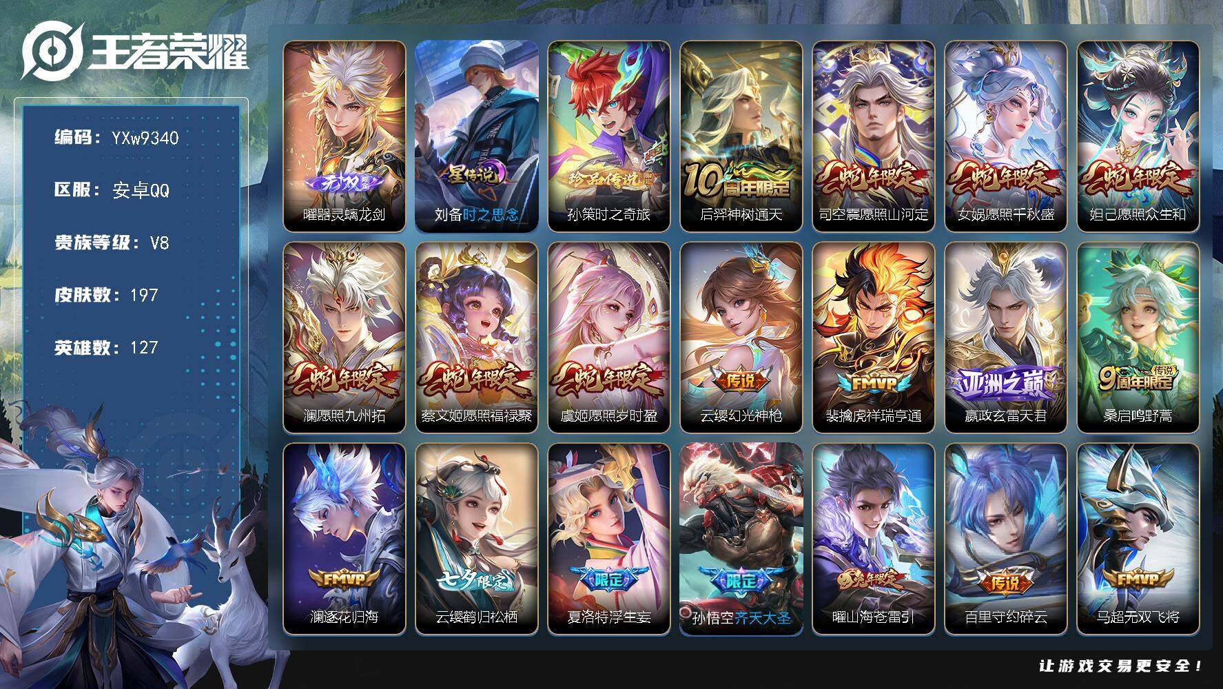 安卓微信-9传说-1无双-126皮肤-125英雄-无双王者-王者账号,皮肤看图。可议价