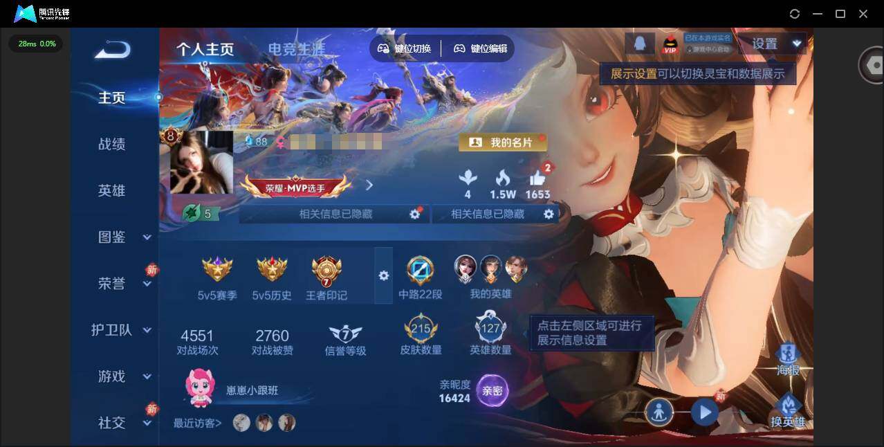 实名: 可修改 贵族等级: V8 英雄数: 127 皮肤数: 255 荣耀水晶