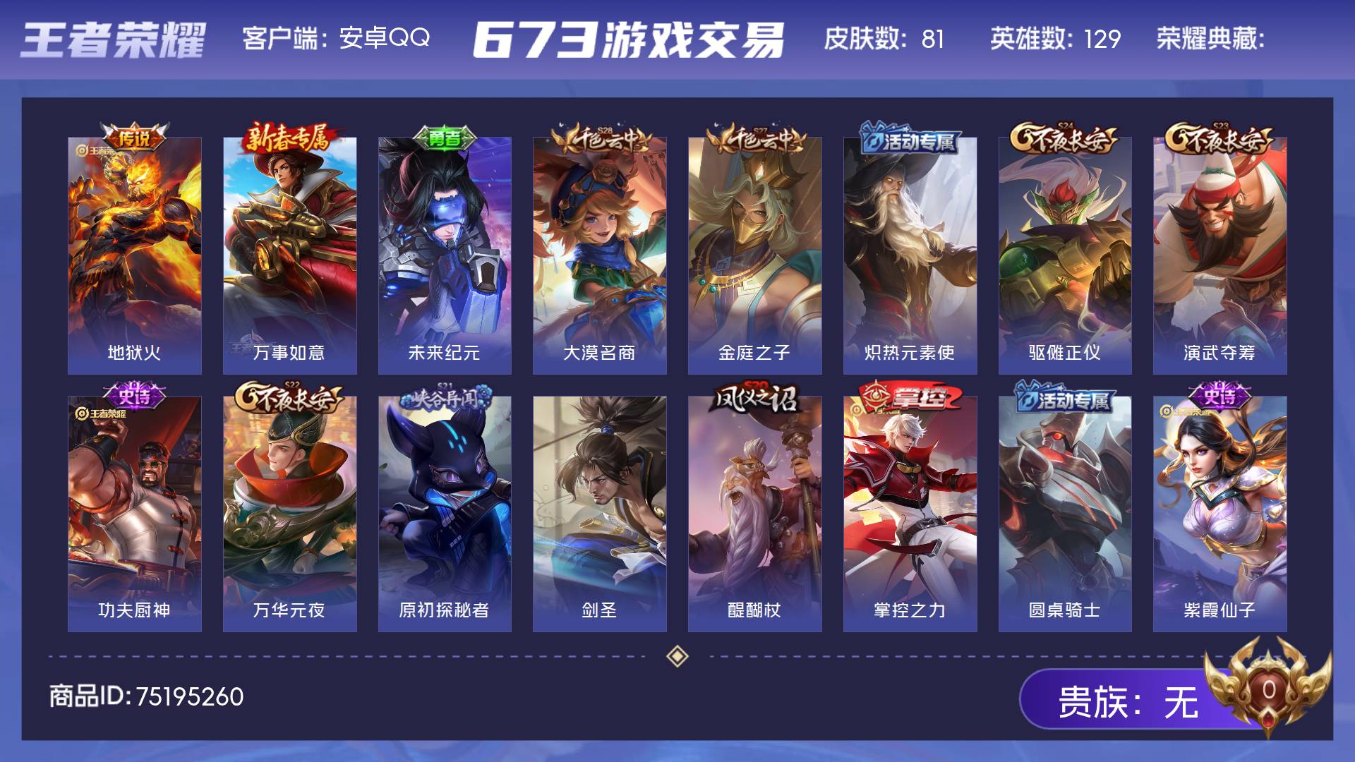 【至尊宝 81皮肤可秒换绑】安卓QQ-109英雄-81皮肤